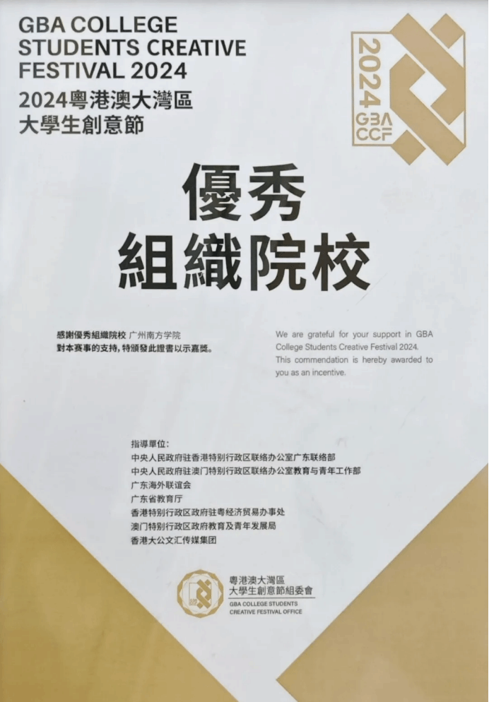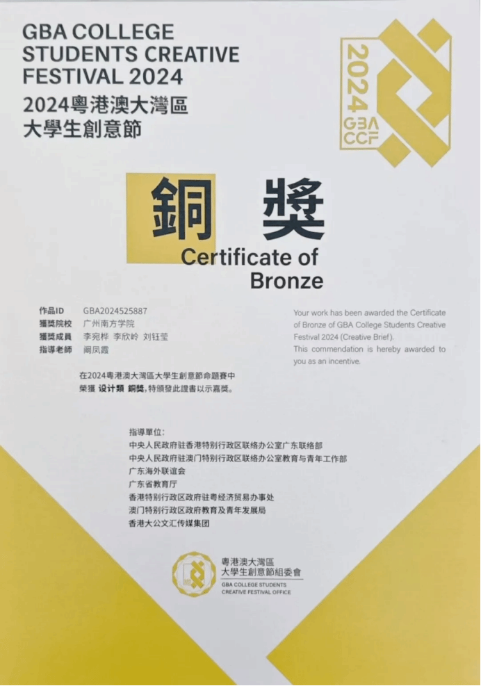 粤港澳大湾区大学生创意节大赛是国际级大学生文创赛事,由中央人民政府驻香港特别行政区联络办公室广东联络部、中央人民政府驻澳门特别行政区联络办公室教育与青年工作部、广东省教育厅等指导,暨南大学及粤港澳大湾区企业家联盟联合主办,旨在激发大学生的创意潜能,推动区域文化创新发展。