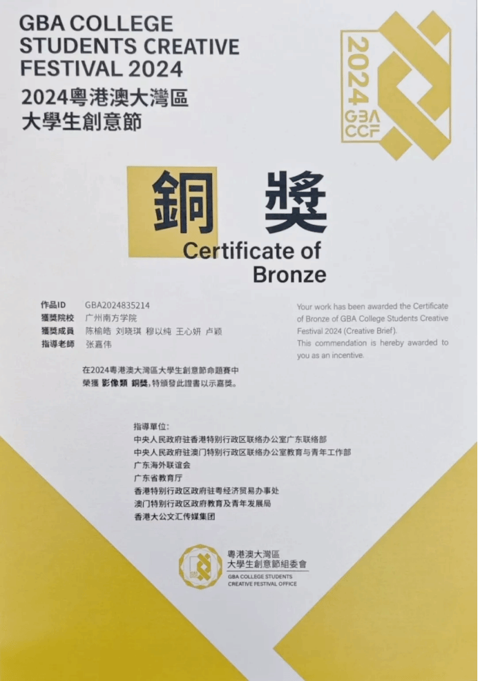 由阚凤霞副教授指导的作品荣获命题赛设计类铜奖,团队成员包括李宛桦、李欣岭和刘钰莹;张嘉伟老师指导的作品获得命题赛影像类铜奖,团队成员为陈榆皓、刘晓琪、穆以纯、王心妍和卢颖。此外,威廉希尔williamhill中文因组织工作出色,获得“优秀组织院校”奖。12月29日,由张嘉伟老师带队前往清远参加湾创节颁奖典礼,领取奖项。