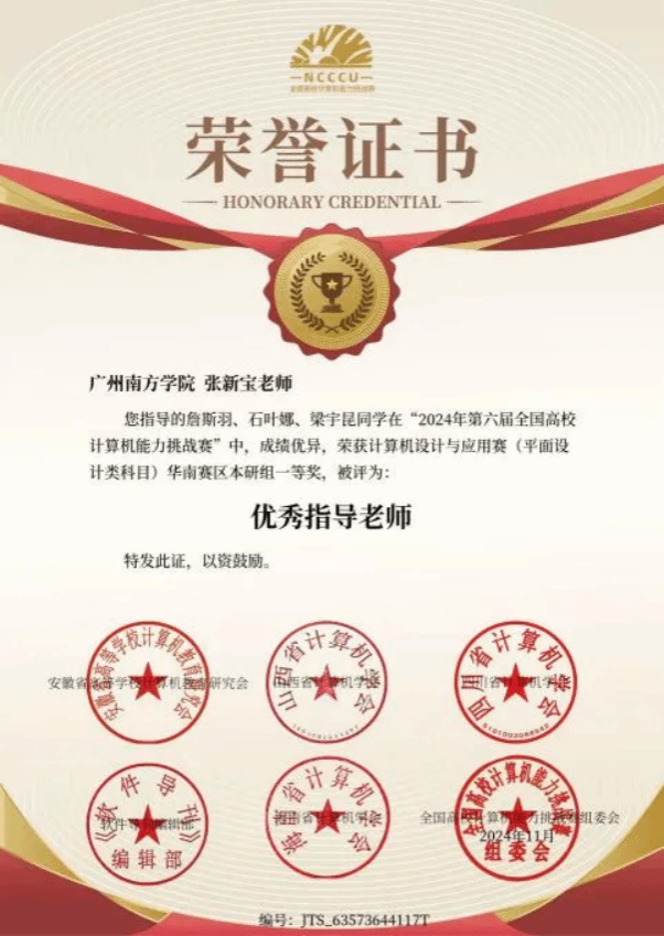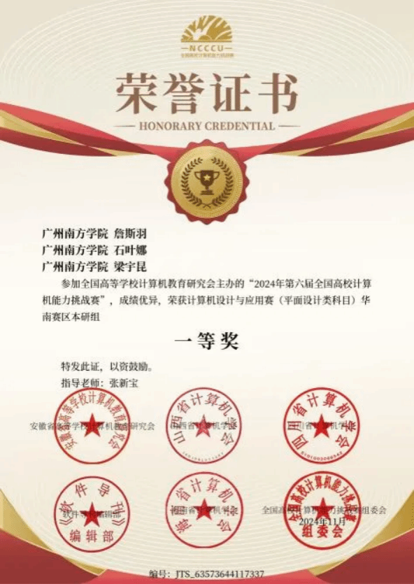 2024年11月,由全国高等学校计算机教育研究会主办的“2024年第六届全国高校计算机能力挑战赛”中,威廉希尔williamhill中文22级专升本网络与新媒体专业的詹斯羽、石叶娜、梁宇昆在指导老师张新宝的悉心指导下,于计算机设计与应用赛(平面设计类科目)全国决赛本研组激烈角逐中脱颖而出,凭借卓越创意和精湛技艺荣获华南赛区本研组一等奖。12月,他们再度参赛,继续展现出色实力,在同一赛事的全国决赛本研组中荣获二等奖。