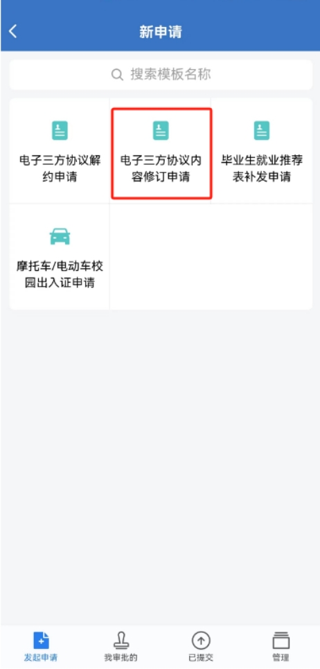 一、申请人进入本人的企业微信,点击“工作台”,进入“审批”,进行“电子三方协议内容修订申请”流程;