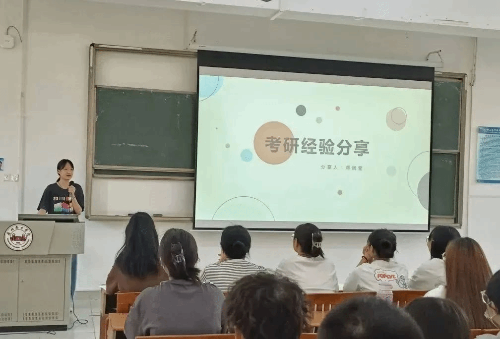 黄琼诗师姐因事务冲突未能到达现场,转为线上分享的方式为大家讲述考研经验。第一,择校方面,建议同学们用灵魂三问方法逐步缩小范围,成功择校;第二,心态方面,可以通过卸载部分软件,将自身精力投入学习而减少网络焦虑;第三,备考英语方面,师姐推荐语法老师(田静)以及强调单词的重要性。师姐衷心祝愿同学们的努力最终得以实现,丰收时硕果累累。