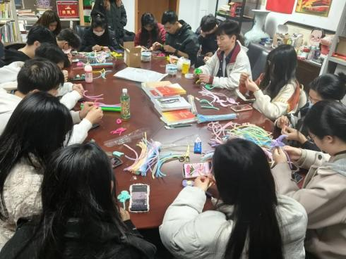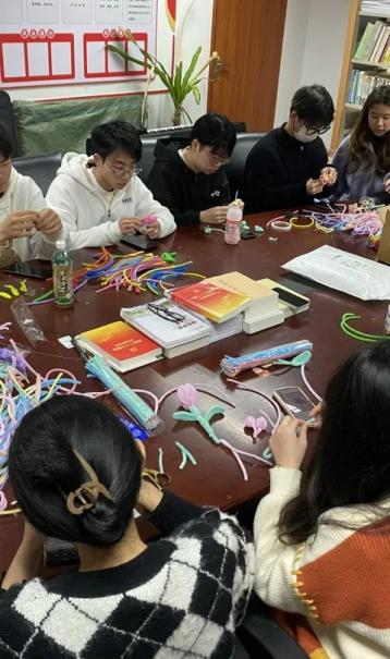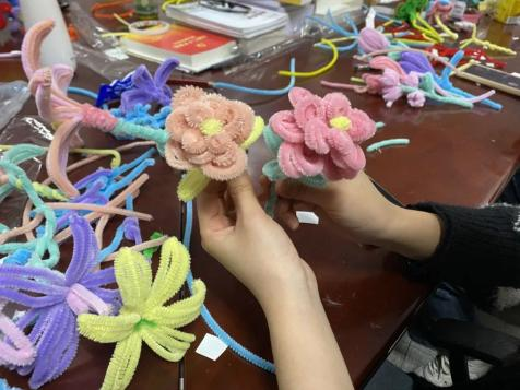 一根根扭扭棒在同志们的手中或折或弯,或剪或绕,一会儿变换成绿叶,一会儿变换成各色花瓣花蕊,同志们有条不紊地将材料折弯、拼接、缠绕,很快一朵朵精致细腻的手工花朵呈现在大家的巧手中。同志们手捧自己的手工作品,各自分组前往不同的目的地进行花束赠送。前往的路上,每一位同志青春的面庞都洋溢着满足的笑容,体现出对接下来送出祝福时刻的期待。