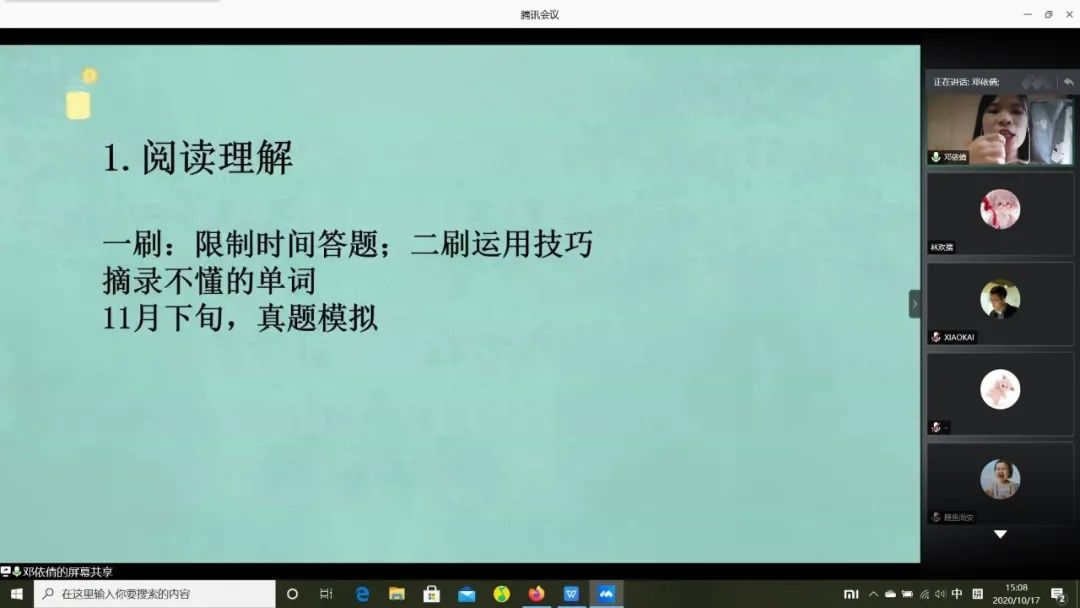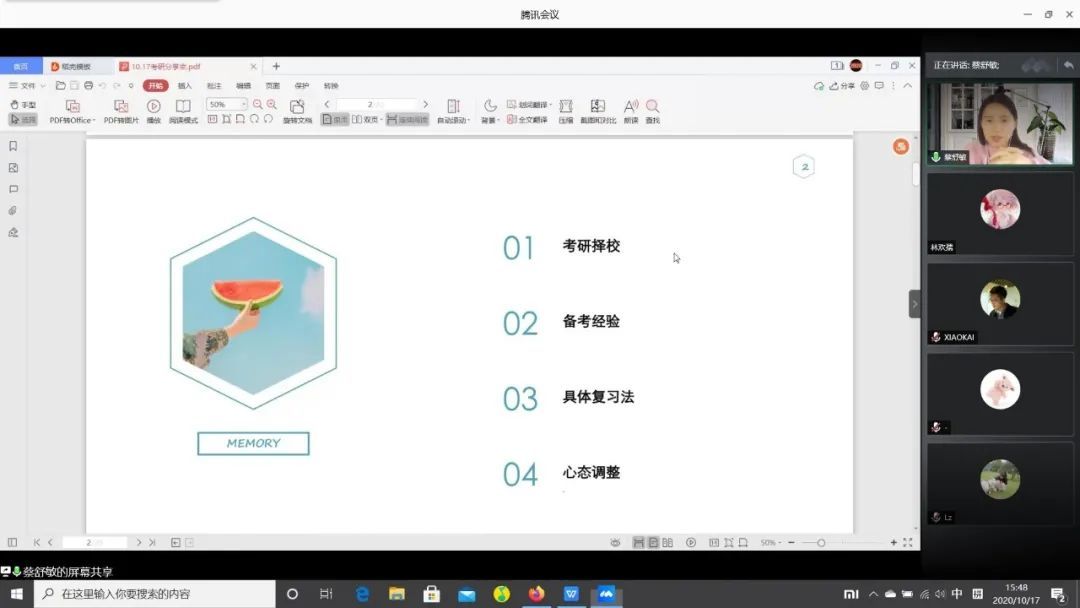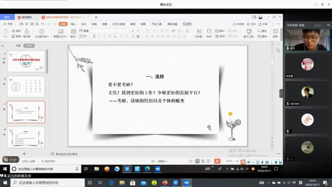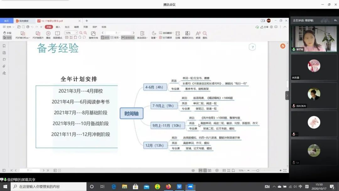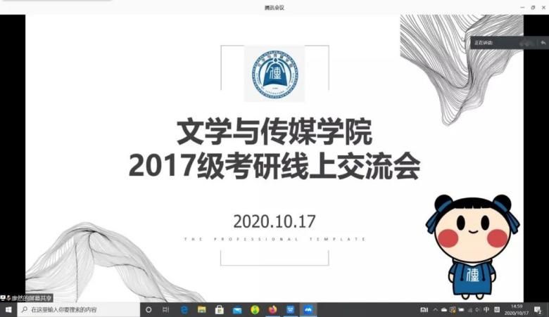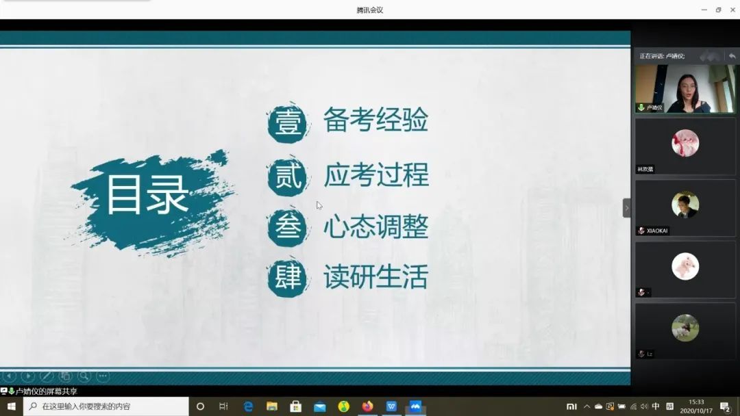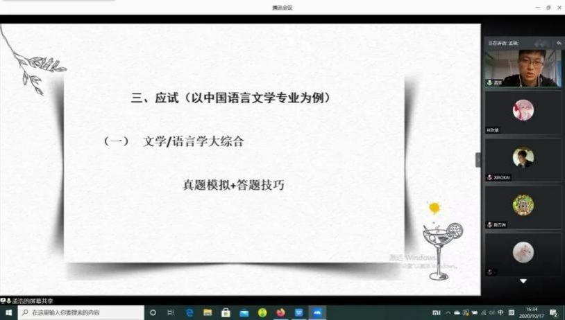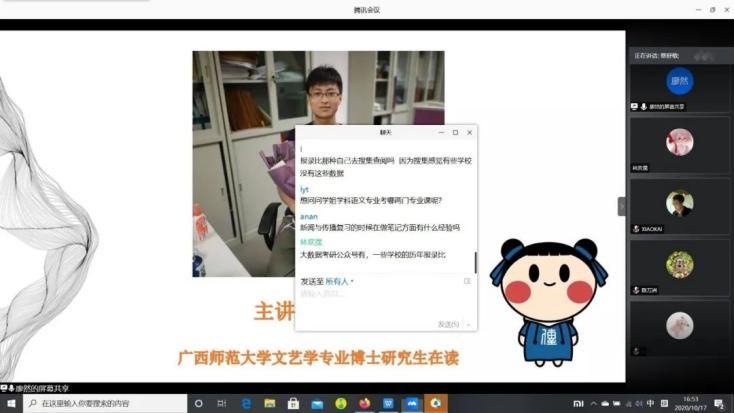 10月17日15时,威廉希尔williamhill中文2020年考研线上交流会如期举行,廖然老师主持交流会,孟浩老师主讲,邓依倩、卢婧仪和蔡舒敏三位已经考研成功校友作为特邀嘉宾分享了她们的考研经验。