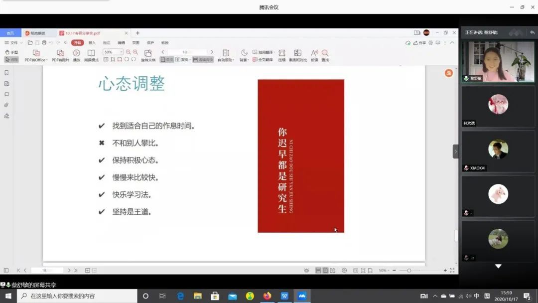在心态调整方面,蔡同学建议大家保持积极的心态,提倡快乐学习法,认为坚持是王道。最后蔡同学以一张图片上的文字祝福备战的同学:“你迟早都是研究生。”