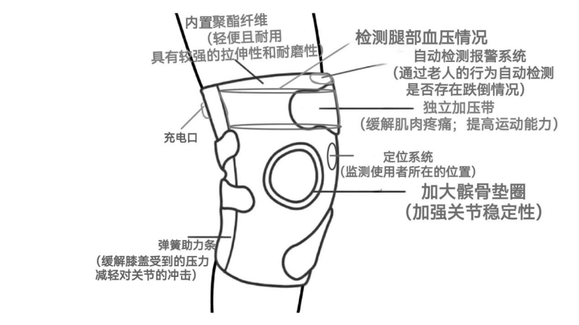 老年人"摔跤"问题一直是受社会广泛关注的现象,而膝部受伤是高发情况,老年人年纪较大,人体的骨头正处于一个快速的衰退期,一旦摔跤,便会给膝部造成不可逆的影响。所以,我们旨在为老年人提供一个舒适性、防护性、监测性的护膝产品,结合线上客服咨询和线下在线服务,为老年人提供安全、信任的产品。