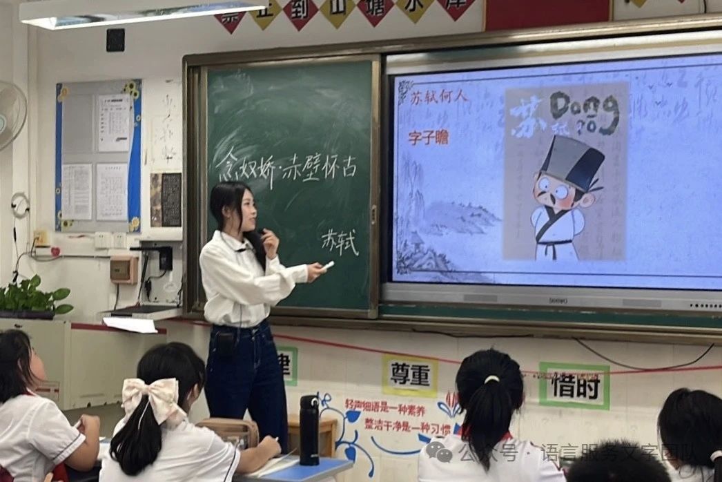 学习这首词之前,小龙老师提问同学们“对苏轼的了解有多少”,同学们争先恐后地举起手来,有的说苏轼是豪放派词人的代表,有的回答苏轼是唐宋八大家之一。经过简短的课堂导入,小龙老师带领同学们正式进入了今天的古诗词课堂。