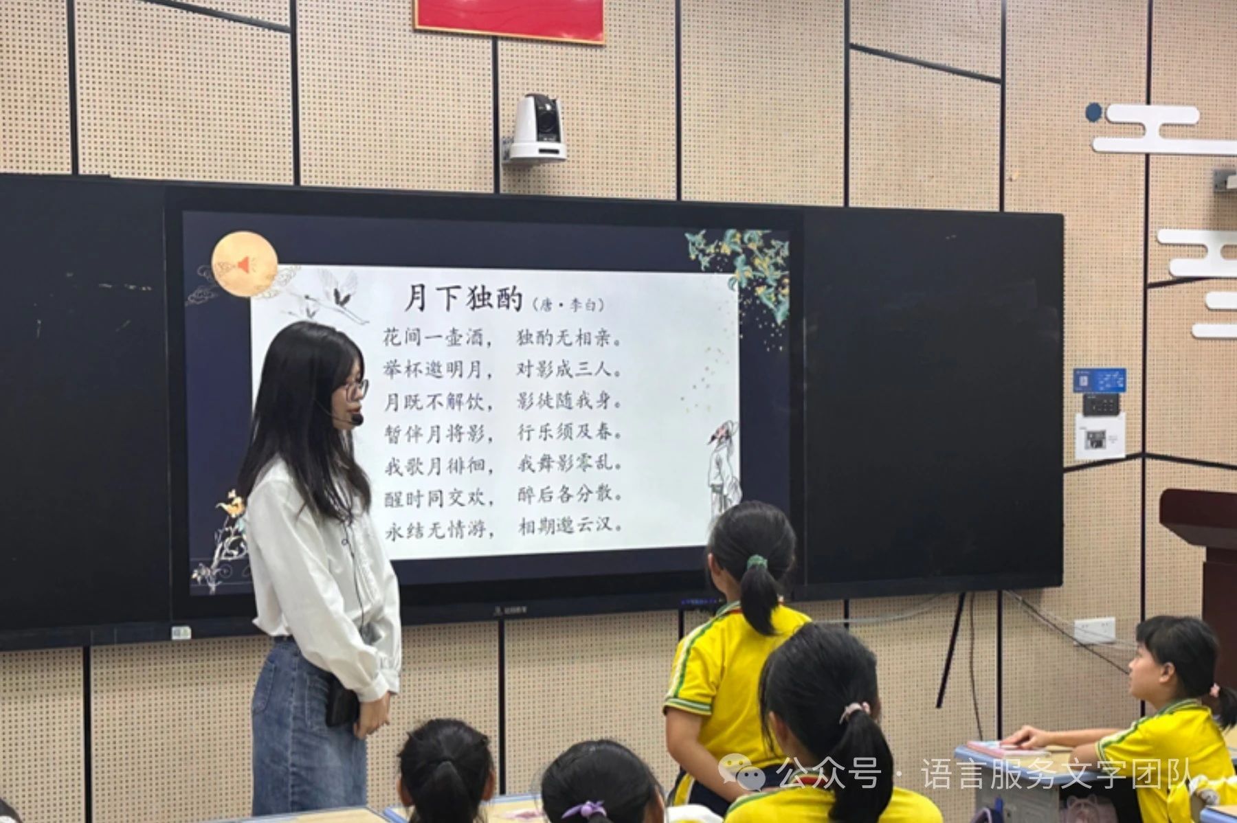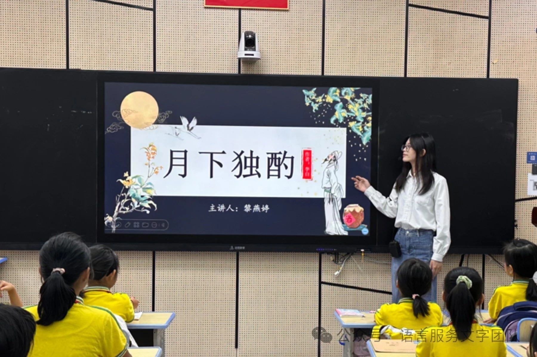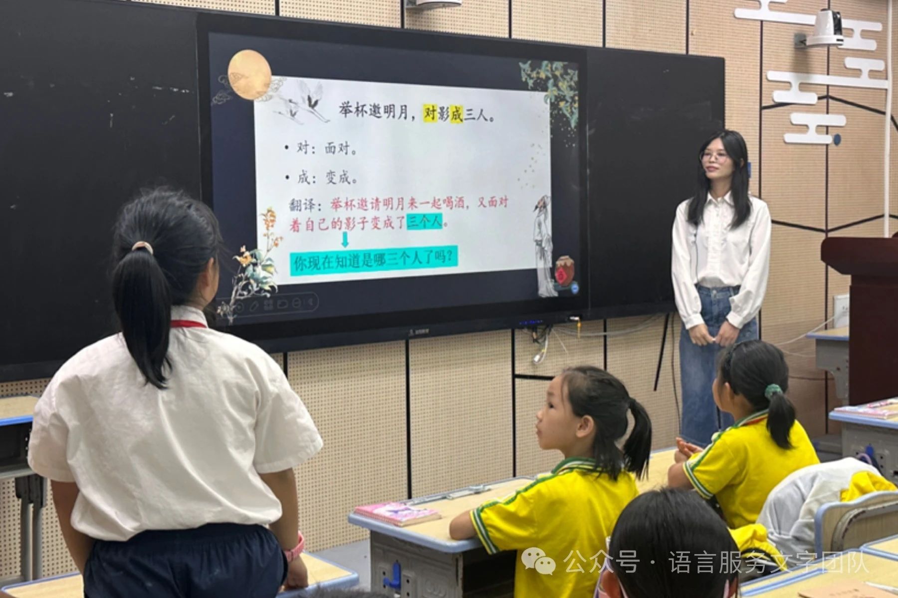接着小黎老师通过形象生动的讲述并结合图片,带领同学们一起学习了李白在整首诗中倾注的思想感情。在老师的引导和鼓励下,同学们从邀月共饮、与影为伴等体会诗人表达的思想感情,争先恐后地举起小手向大家分享自己对本首诗的理解。