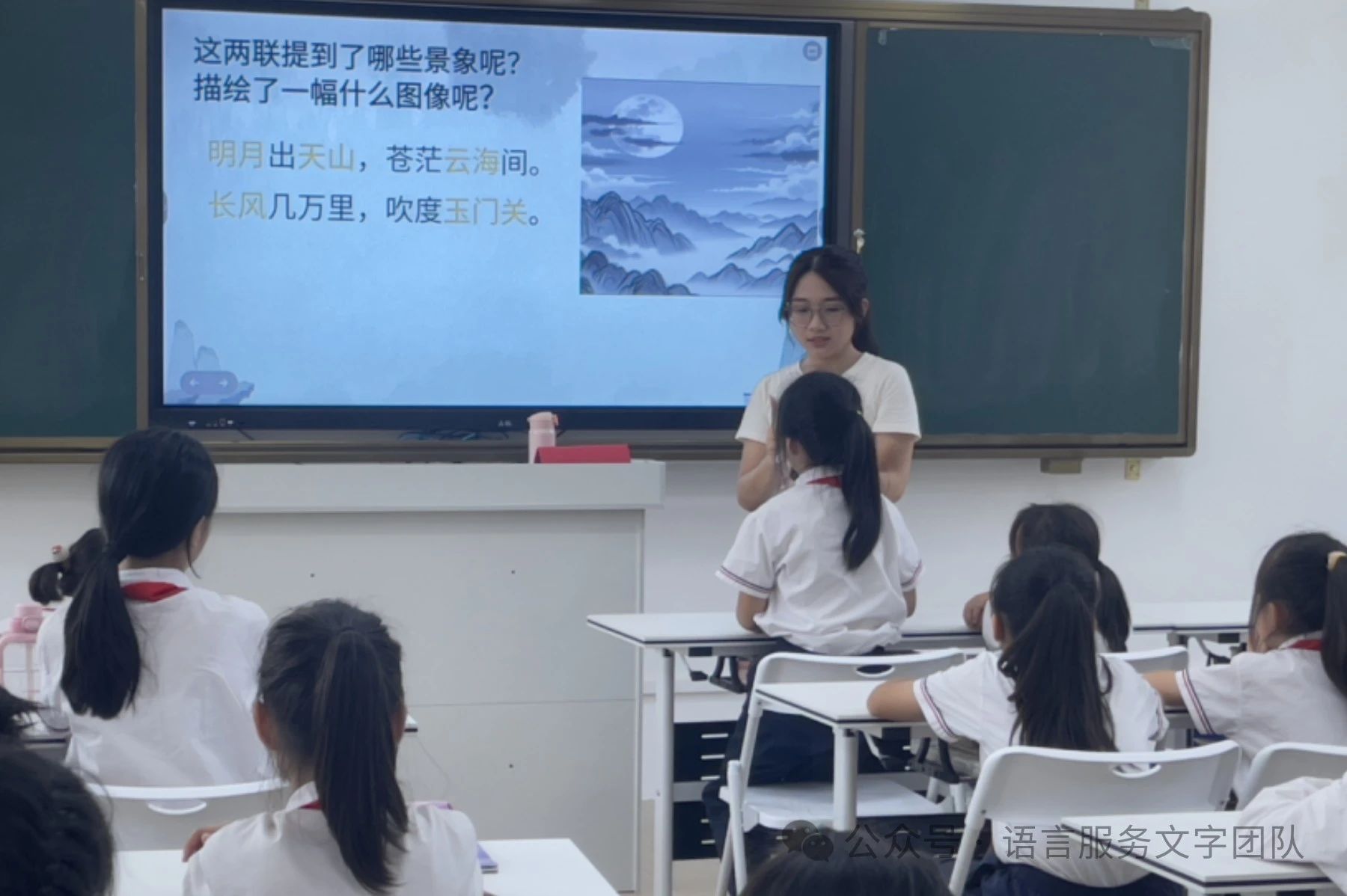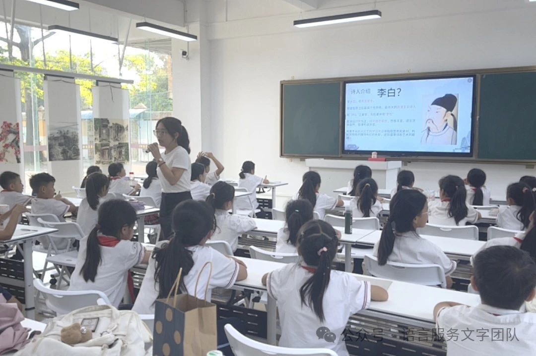 学习诗歌前,小李老师巧设情境,抛出了一个问题,向同学们发问“同学们学过跟月亮相关的哪些诗歌呢?”,话音刚落,同学们都争先恐后举起手来,异口同声地说道:“床前明月光,疑是地上霜。”小李老师引导着同学们由这一首思乡之诗《静夜思》,同学们带着对月亮的好奇,进入了今天的古诗词课堂。