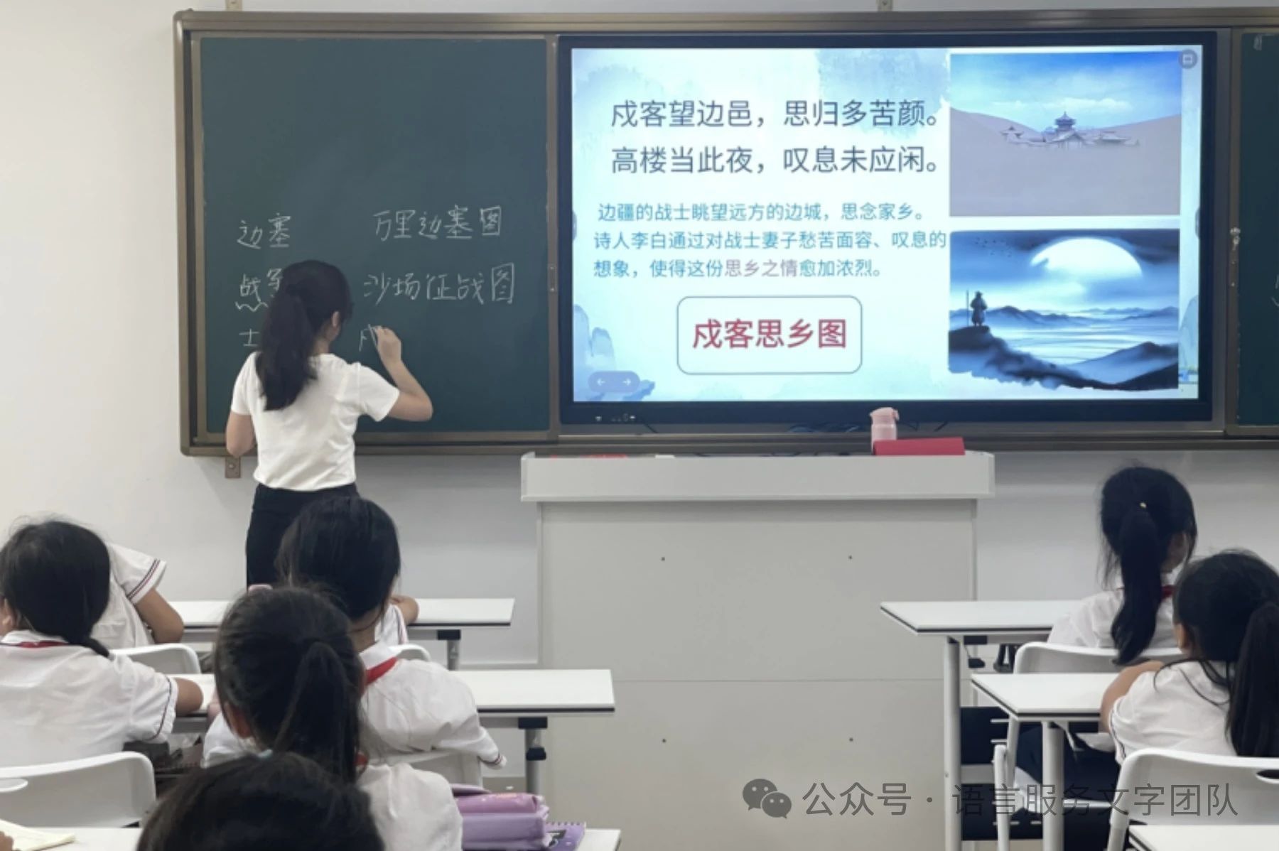 紧接着,小李老师通过讲解诗句,导入历史背景,将同学们带入情景,引导同学们理解诗人运用的借代手法,以戍边的士兵代指所有远离家乡的士兵,表达他们的思乡以及对归乡的渴望,小李老师最后用一幅戍客思乡图加以归纳总结。同学们沉浸在小李老师描绘的画面中,感受字词间所表达出来的离别伤情。