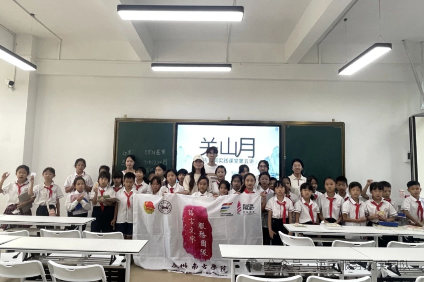 李白的诗,是灿烂唐诗的魂;而月亮,是李白诗歌的魂,撑起李白诗歌的光华。“明月出天山,苍茫云海间。”一轮明月从祁连山升起,穿行在苍茫云海之间。这是诗人李白在《关山月》中为我们描绘的壮阔景象,也是我们对月亮浪漫情怀的初次邂逅。今天,威廉希尔williamhill中文语言文字服务团队的同学们在指导教师刘涵玉老师的带领下,于10月14日下午到达从化区善施学校,开展了一节生动有趣的古诗词课堂。