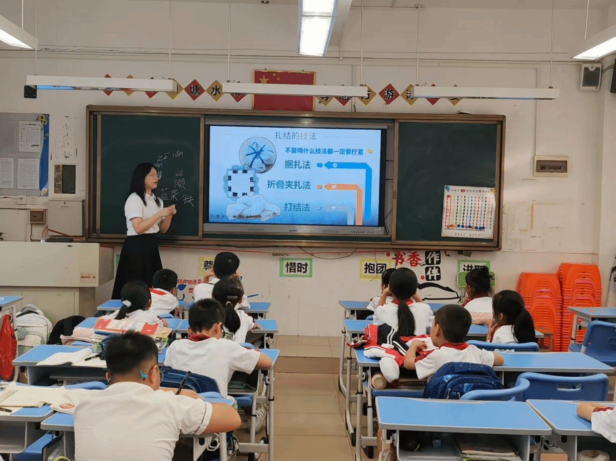 课堂伊始,小杨老师以巧妙的提问“同学们,从今天的课堂主题中,你们能猜到我们将要探索的非遗文化是什么吗?”为引子,瞬间激发了孩子们的好奇心和探索欲。随后,通过分析两张图片的不同之处,她巧妙地揭示了本次课程的主题——扎染。