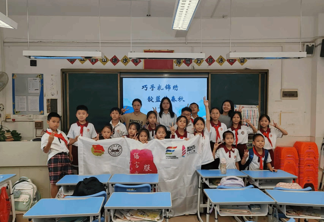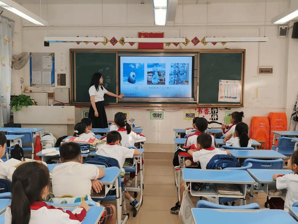 课程的尾声,小杨老师通过一个视频带领小朋友们回顾本节课的内容,加深他们对扎染的了解。此次非遗课堂整堂课在欢声笑语中落下帷幕,但孩子们对扎染艺术的热爱和探索却才刚刚开始。下周,流溪小学的同学们还会在语言文字服务团队的带领下,亲身体验非遗传统技艺,动手制作属于自己的扎染。