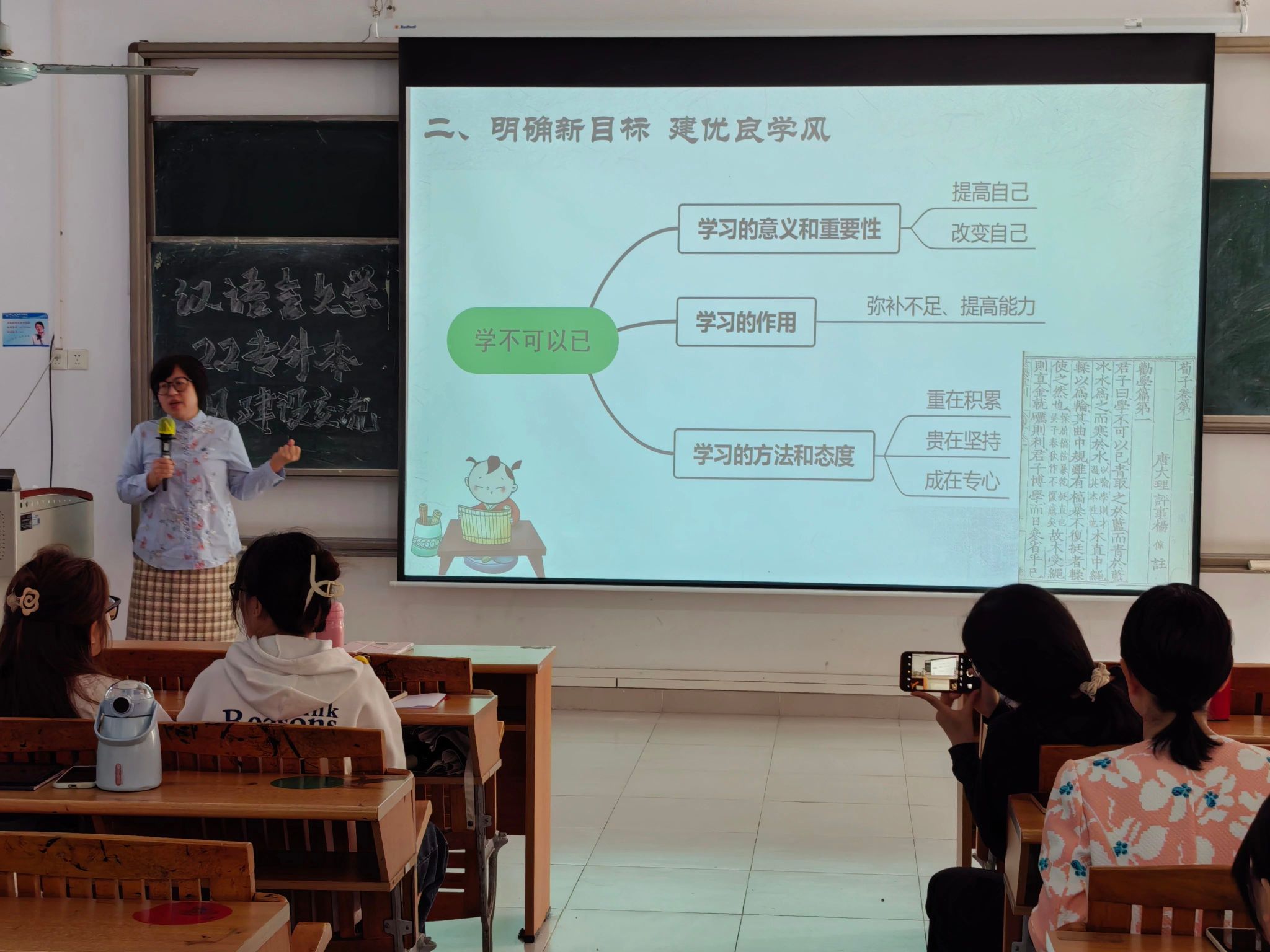周凤玲教授引用《荀子·劝学》中的“学不可以已”,强调了学习是一个持续不断的过程。她指出,学习的核心在于自我提升和改变,通过学习来弥补不足、增强能力。周教授鼓励学生们培养终身学习的习惯,保持对知识的持续渴望和追求,从课堂和生活中不断吸收新知和经验。她提倡的学习态度和方法可以概括为:重视积累、坚持不懈、专注投入。