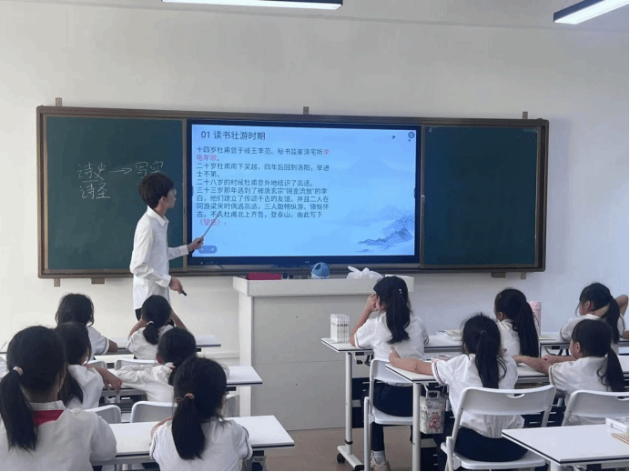 课堂伊始,小廖老师先是通过猜谜的方式,引导小朋友们猜猜今天上课要学习的是哪个诗人。同学们很快就猜出是诗人杜甫,由此点燃了同学们上课的热情。