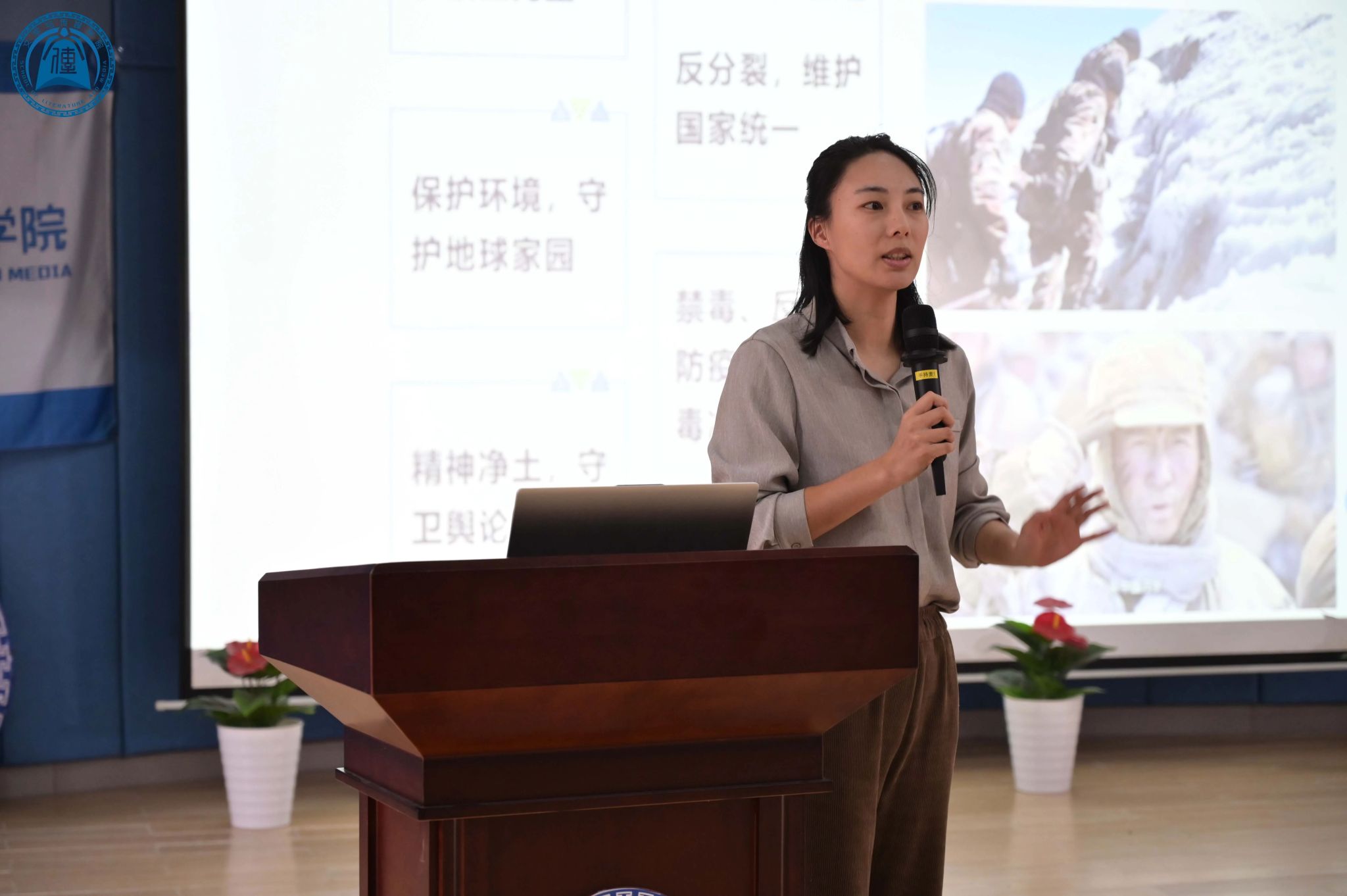 随后,原月老师以“清澈的爱,只为中国”这一句话,引出十八岁边疆战士陈祥榕在面对外敌侵扰边境时,勇敢挺身而出献出自己宝贵生命后的故事。此外,原月老师还提到追“星”摄影师韩佳龙,介绍韩佳龙实施的志愿军肖像计划。这个计划旨在帮每一位志愿军老兵拍照,让志愿军老兵身影重回大众视野中,向人民大众传承志愿军的精神。