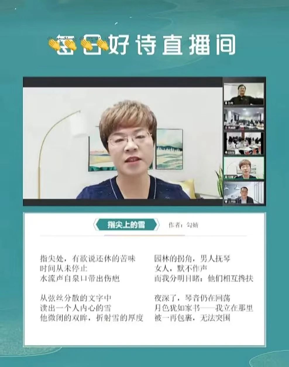诗歌作者勾婧老师首先为大家朗读和介绍了她的原创作品《指尖上的雪》。这首诗灵感源自她在北方小镇亲历的一个冬日,当时她目睹了漫天飘洒的雪花与银装素裹的大地,那番景象深深触动了她,促使她创作出了这首诗。勾婧老师还深情地分享了她在创作这首诗过程中的内心感受与心境变化。