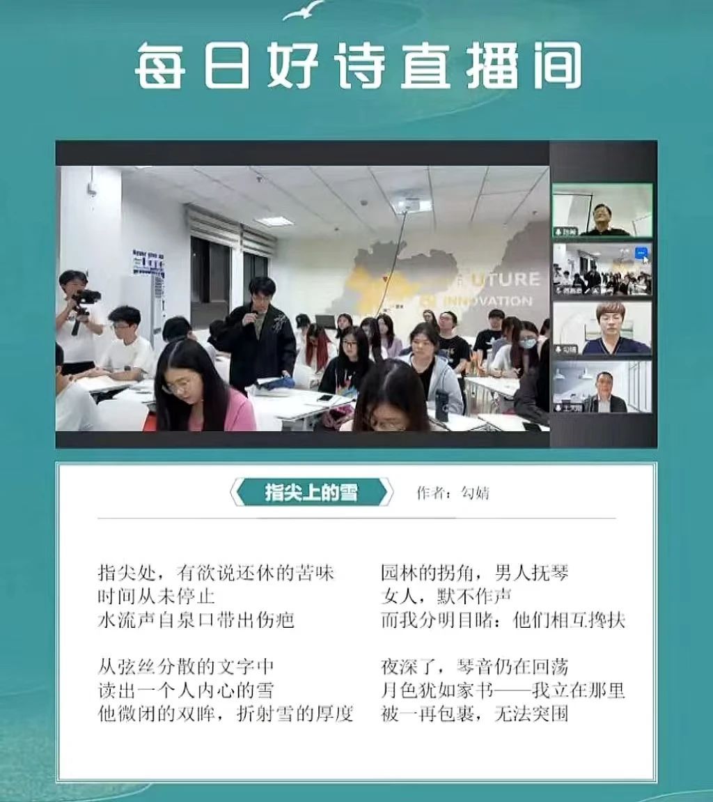 诗必有教,诗歌的审美与创作皆有赖于教育,诗艺的探讨与切磋,正是诗歌教育题中应有之义。为了活跃校园文化,提升同学们的美育素养,深化对诗歌时代精神的理解,培育学生诗歌鉴赏与创作能力,2024年11月12日晚20点,中国诗歌网的“每日好诗直播间”走进广州南方学院,顺利完成面向全世界的一个半小时直播活动。