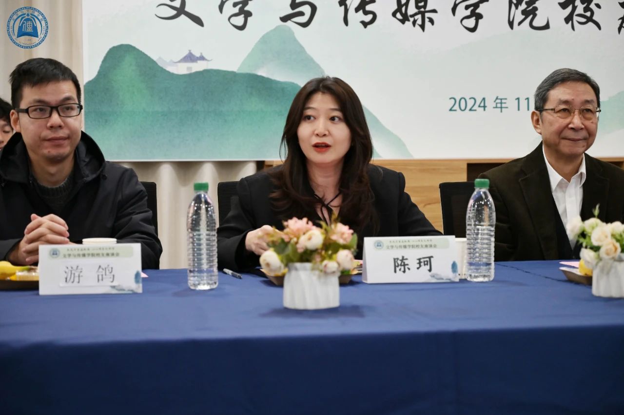 新闻与传播学系主任陈珂老师为校友们介绍学院的人才培养方向。陈珂老师分四点进行讲述,第一是以理论为基,文传学院优秀的师资队伍将一如既往保障人才培养的专业理论根基;第二是应用导向,学院三个专业都致力于培养学生将所学知识转化为实践成果;第三是以产促教,学院教师团队积极进行教学创新改革,培养适应数字化传媒文化产业发展所需人才;第四是智创融合,学院将加快构建智慧课程,让师生共享智慧化教学平台的同时发挥面向新技术的创新探索精神。最后,陈珂老师感谢校友们给予的相关支持,并期待未来保持深度联系,共谋发展。
