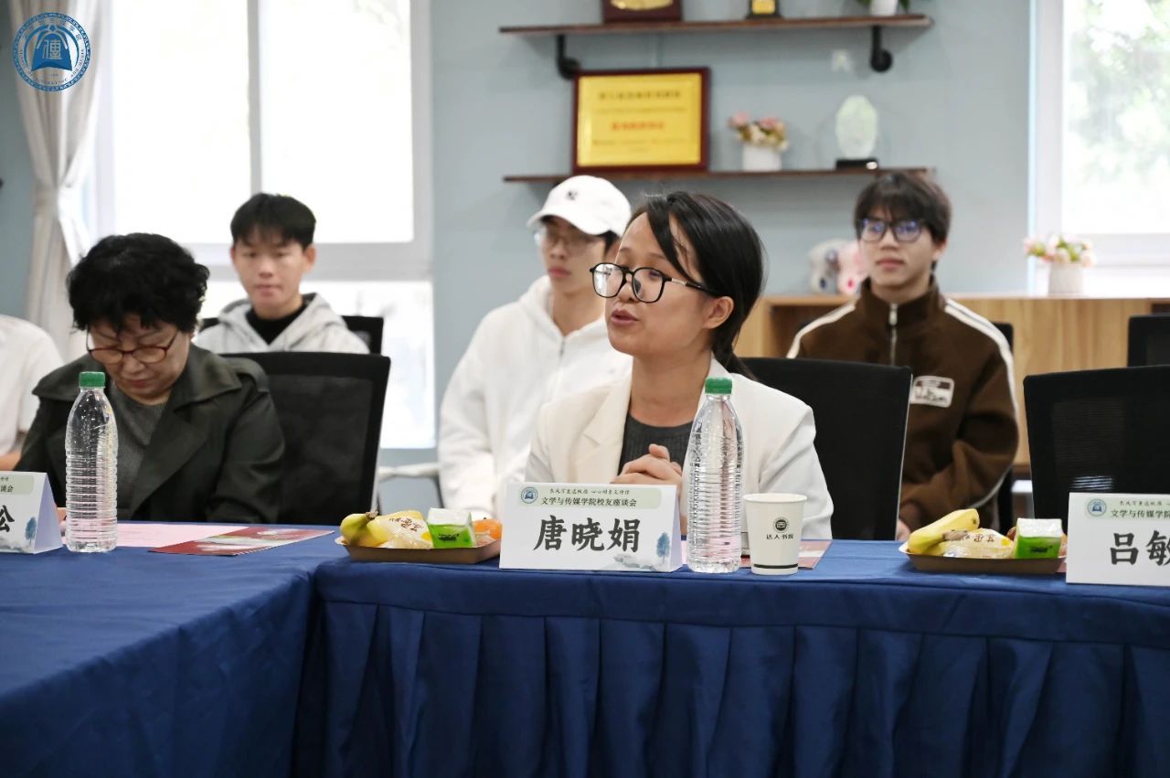 2010级校友唐晓娟在发言中深情感谢孙立院长的辛勤付出,并表达了对学院发展成就的自豪感。她强调了新闻学学习对她个人成长的深远影响,包括培养了冷静思考、分析问题和解决问题的能力,以及对人的深切关怀。唐晓娟还提到了在深圳的教研经验,并建议学生们在数字化时代学会有效利用AI技术,提升自己运用AI软件的专业技能。