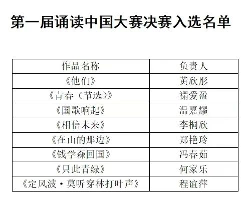 第一届诵读中国大赛初赛晋级的名单已经揭晓。决赛将于2024年12月11日15:00在1-205举行。让我们一同期待选手们的妙语生花吧!