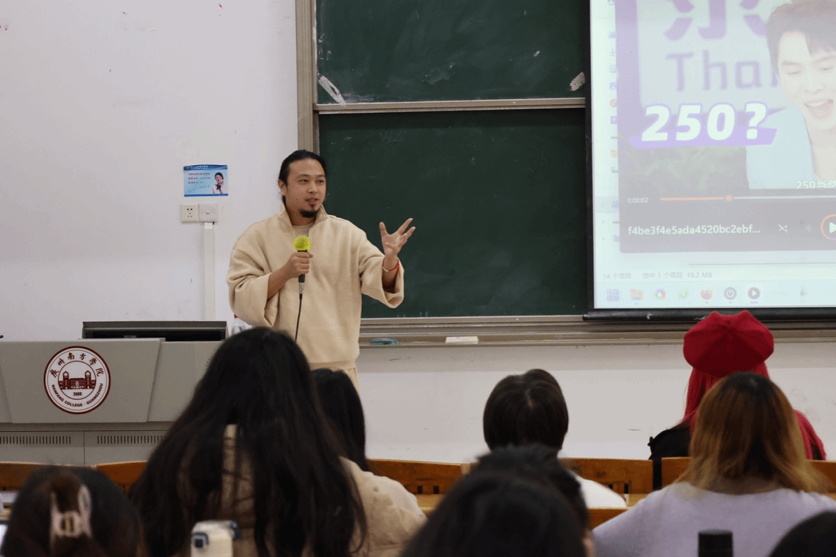 卢哲颢校友用自己的泰语主持经历诠释了“敢想敢做”的精神。他坦言,尽管泰语水平并不算专业,但始终没有放弃任何一个展示自我的机会。这种勇于尝试的态度,不仅帮助他完成了与多位泰国知名明星的采访,也让他成功主持了电视娱乐节目《泰娱汇》。为进一步强化这一观点,他还特别邀请团队实习生——2022级新闻学3班的朱茵同学分享了她在北京、上海和泰国三段实践经历中的成长感悟。朱茵通过自身的探索经历,向大家展示了专业知识与实践结合的巨大作用。同时,他也提醒同学们,敢冲敢拼是可贵的,但更需结合自身实际技能,稳步前行,才能走得更远。