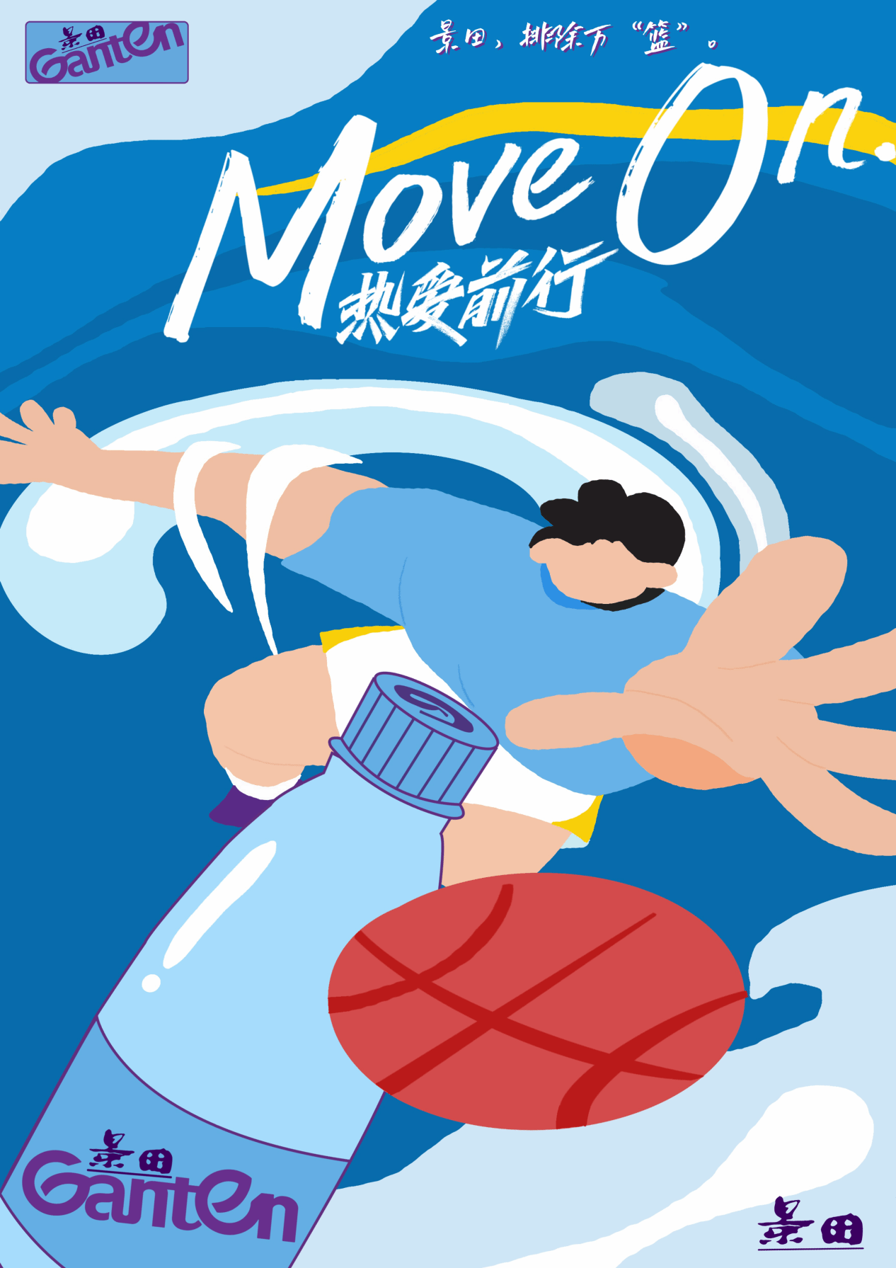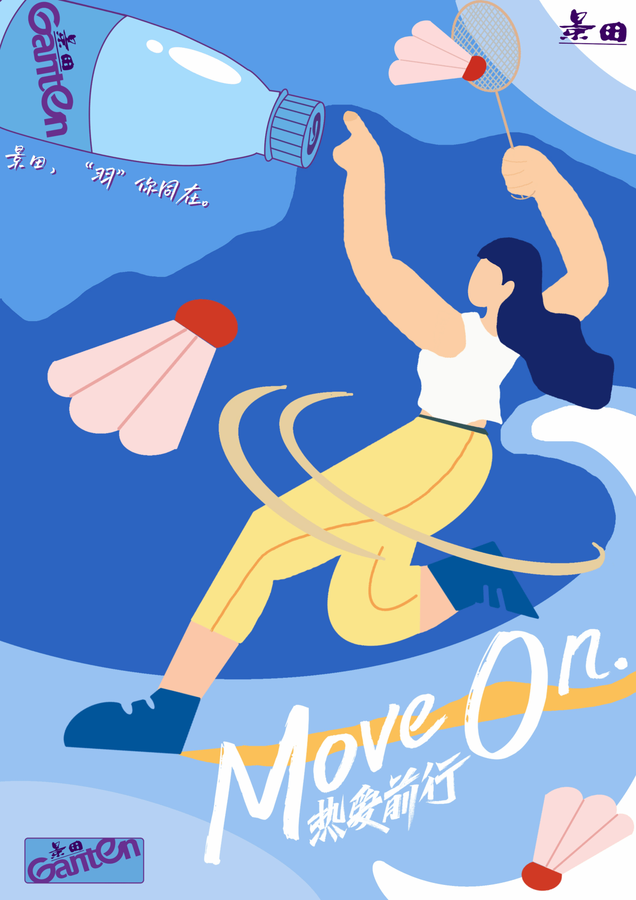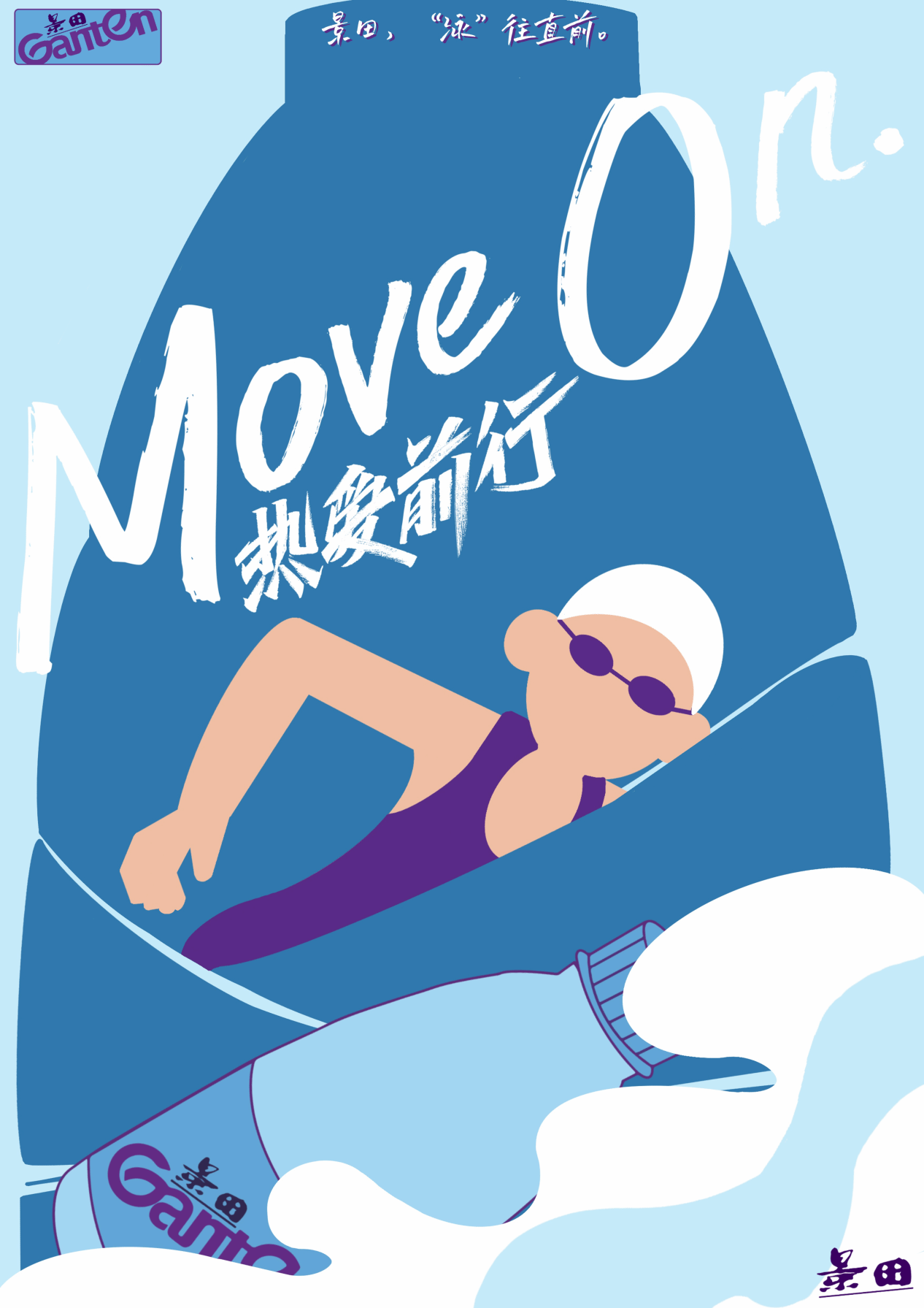 本系列平面设计广告以“景田伴你,运动同行”为主题,通过一系列生动、活泼的海报展示了景田品牌的核心理念。海报的整体风格活泼、色彩鲜明,选用了浅蓝色作为背景色,同时在背景上散布着一些深色的点状图案,这些图案既增加了画面的层次感,又寓意着生活中的挑战与机遇。而红色与紫色的泳衣则形成了鲜明的对比,使海报更加醒目和吸引人。希望通过这系列海报,能够激发人们内心的热情与勇气,鼓励他们勇敢地面对生活中的挑战与机遇,与景田一起勇往直前!