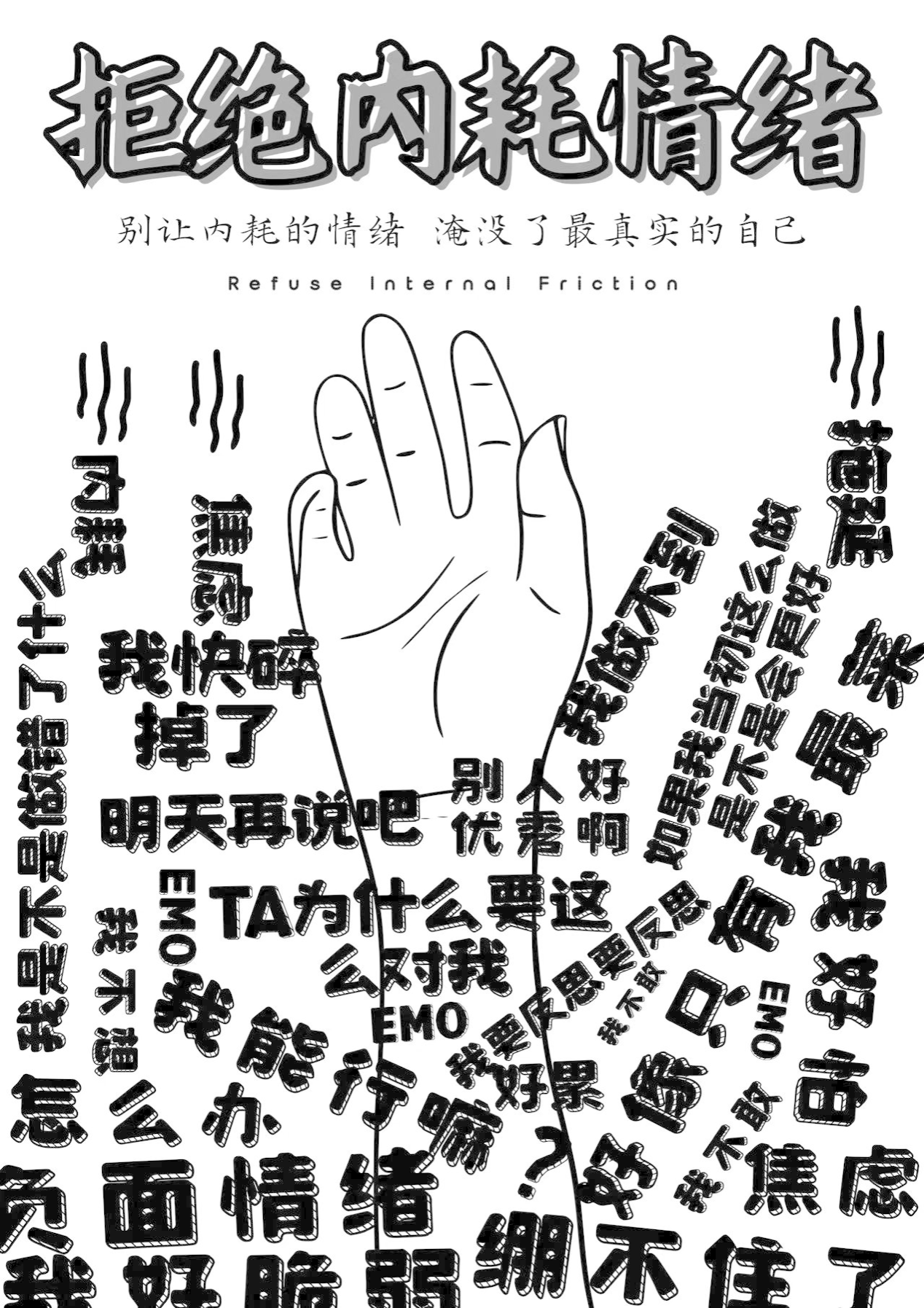 随着社会的不断发展,越来越多年轻人面对生活的压力和琐事逐渐开始精神内耗,比如焦虑、拖延、自我怀疑等情绪不断侵蚀着自己的精神世界。这些内耗情绪像洪水一样,把最真实的自己淹没甚至杀死。此海报创作元素便是采用常见的内耗话语,同时也希望广大青年能够正视自己的优点,拒绝内耗情绪,不要让内耗淹没了最真实的自己。