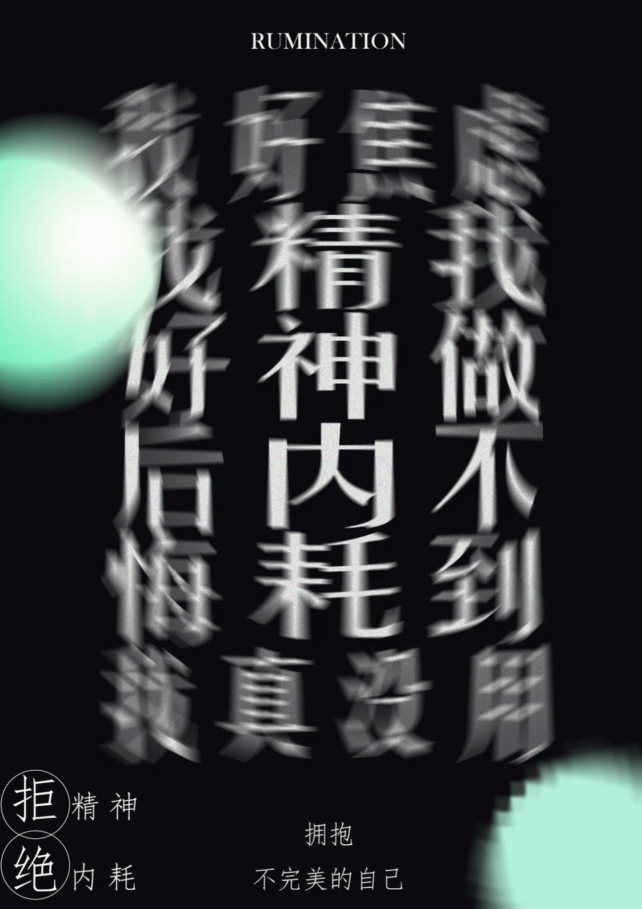 画面中心极具冲击力的眩晕文字是核心创意。选用带有强烈动感、扭曲变形仿佛不断旋转的效果来表现“精神内耗”,模拟人陷入自我怀疑、自我纠结、思维混乱时的天旋地转、无法停歇的心理状态,让观者瞬间能共情那种疲惫与煎熬。