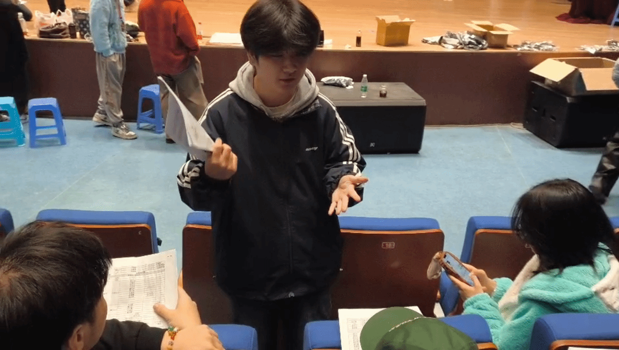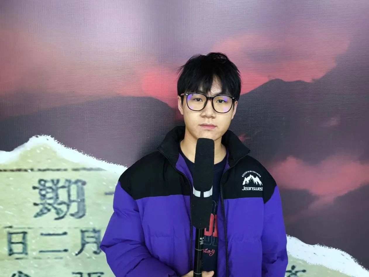 吴嘉霖同学是创意小品《热血乒乓》的主角扮演者之一,他同童童讲述了他是如何与《热血乒乓》结缘的:“一开始是通过朋友了解到文传晚会新增了一个小品,听到节目名称我很兴奋,因为我很喜欢乒乓球这项运动,平时也经常参加学校的乒乓球比赛,加上我在大一、大二年级都参与了文传晚会幕后工作,今年却没有机会参加,为了不留下遗憾,我鼓起勇气报名了小品演员的试镜。”然而在彩排过程中,吴嘉霖同学却也遇到了许多没有预料到的问题和困难。由于是新增的节目,吴嘉霖同学只有大约一周的时间熟悉剧本和带入角色,除了客观上的问题,吴嘉霖同学心理上也有一些困难需要克服:“这是我第一次登上这么大的舞台,也是第一次演小品角色,所以需要克服舞台恐惧以及放下以往的一些包袱。”尽管困难重重,但是在主创团队和指导老师们的帮助下,很多之前担心的问题都迎刃而解:“我感受到一个团队的团结的重要性,以及作为学生工作者对文传晚会要勇敢地去奉献与展现。”