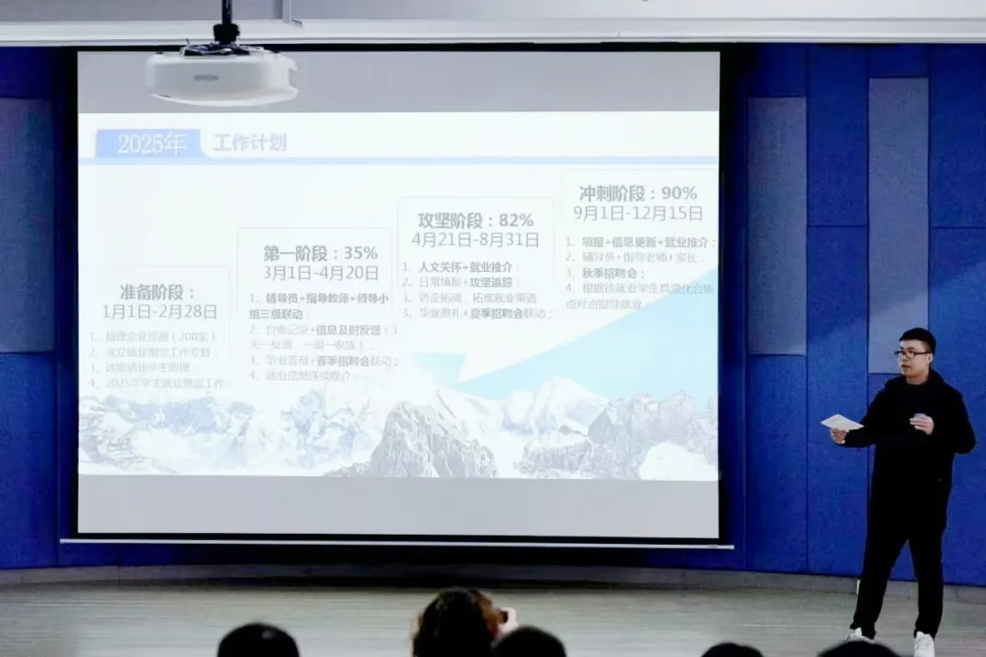 游鸽副院长对2024年的学院就业工作进行了分析总结,并就2025年的就业与产学研工作计划做出了展望和部署。首先,他提到2024年学院通过“访企拓岗”行动和多层次校园招聘体系,有效促进了各方沟通与合作。其次,他指出2025年学院面临就业工作新挑战,为此将创新工作模式,确保就业工作的全链条保障、全过程管理和全方位服务。最后,他强调了2025年就业与产学研工作的方向,鼓励聚焦育人模式的创新,推动资源互联互通,引导学生提升竞争力,构建特色教育体系,以推动高质量充分就业发展为目标。