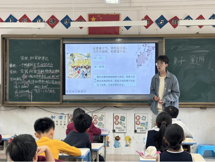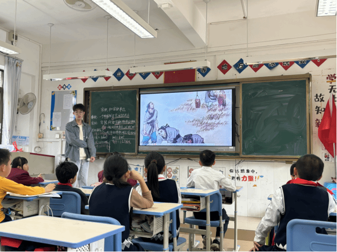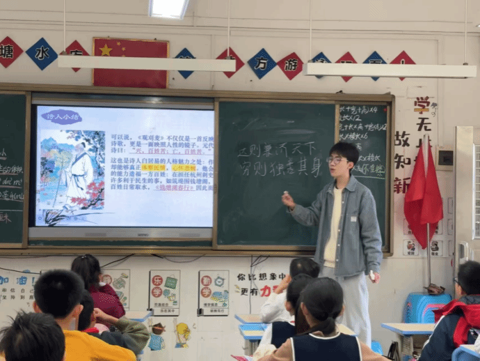 大家好,我是来自22级汉语言文学的廖翊博。古诗词课堂已经进行了两个学期,十分高兴能够站在这里为孩子们讲解古诗词。在这个过程中,我收获颇丰,也对教师这个职业有了更深刻的理解。感谢一直支持我的老师和朋友们,还有在义教中遇到的活泼可爱的孩子们。愿你们今后眼中有星河闪烁,心中有山海广阔,以梦为马,勇往直前。每个人都如星辰般闪耀,希望你们都能绽放出属于自己的光芒。“所谓人者,皆为星辰。”