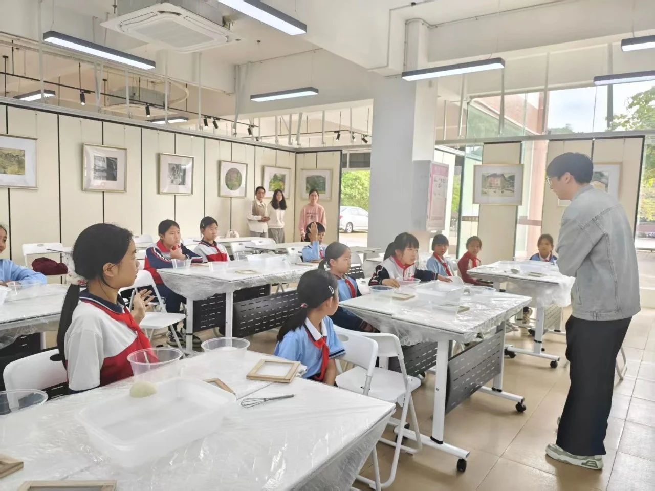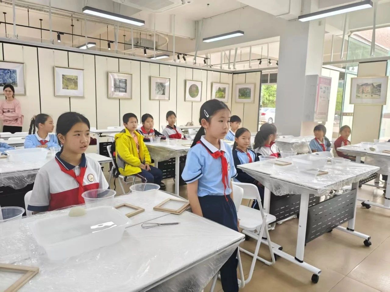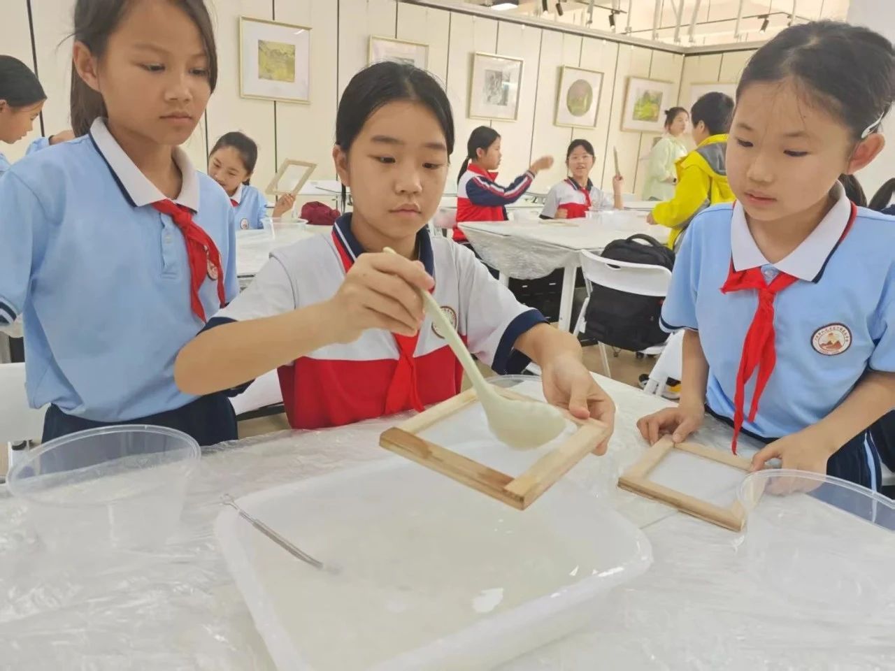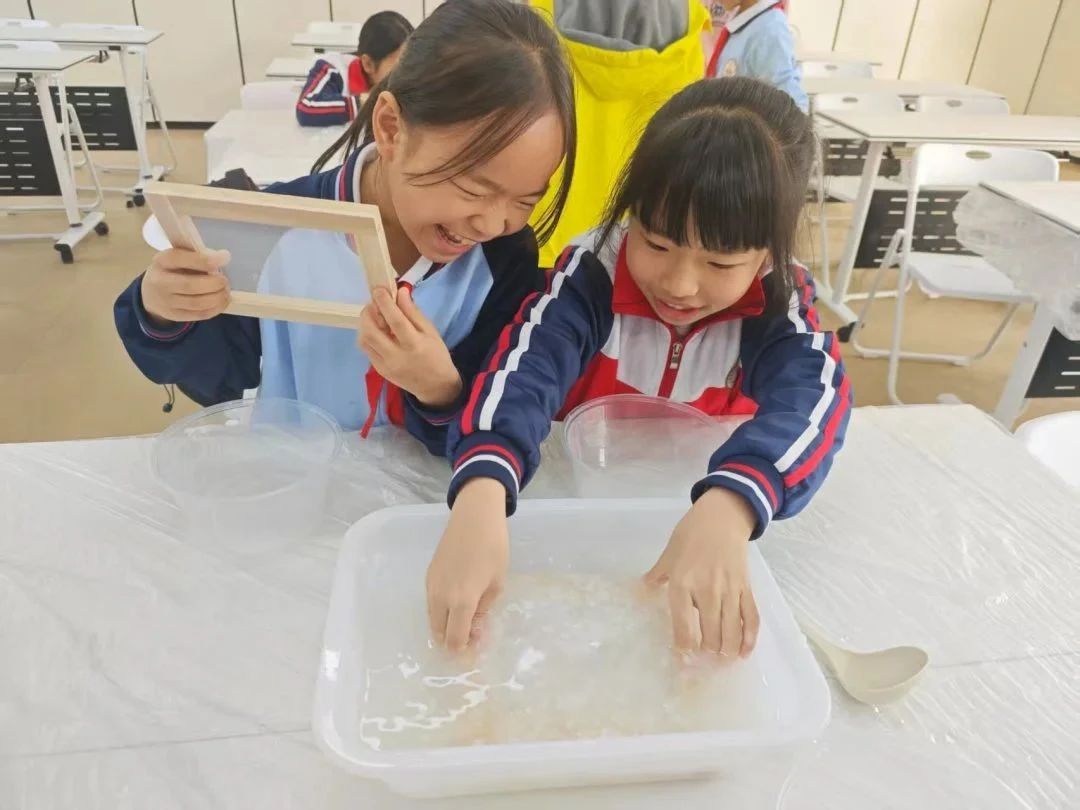理论知识讲解结束后,便进入同学们大展身手的实践环节。小高老师先介绍了实践所需的材料,接着重点强调了几个关键步骤,随后便让同学们动手实践。在小高老师和小助手的指导下,同学们有条不紊地进行操作:首先,将纸浆放入盆中,用勺子搅拌均匀;接着,拿起抄纸帘,缓缓从水中捞起,让纸浆均匀地附着在抄纸帘上,挤干多余水分,纸张逐渐成型;之后,在纸张中加入各色干花花瓣;最后,将纸张连同木板一起放在通风处晾晒。在整个过程中,同学们相互协作,遇到问题积极向小高老师和小助手请教。最终,同学们都制作出了一张属于自己的纸。