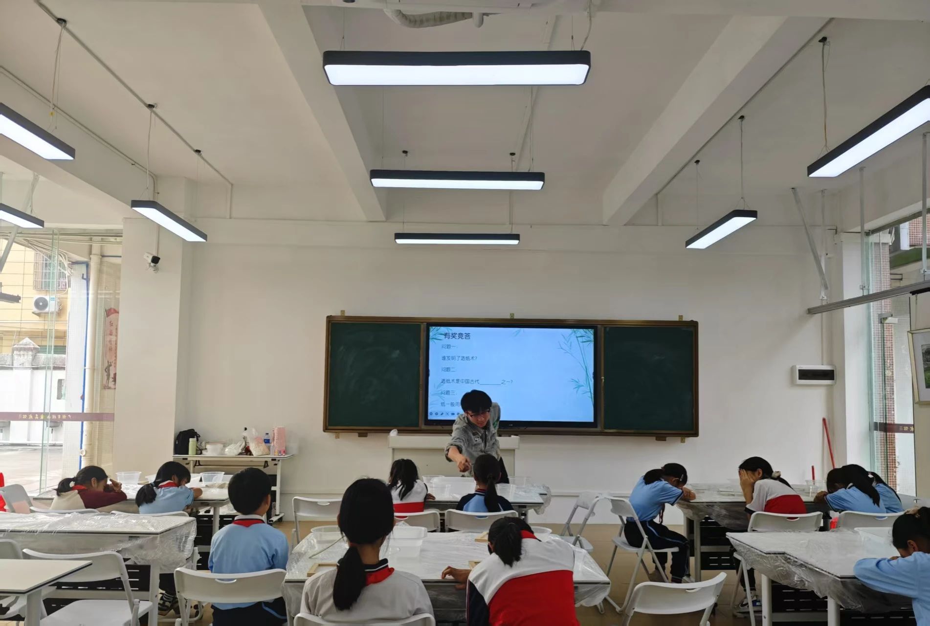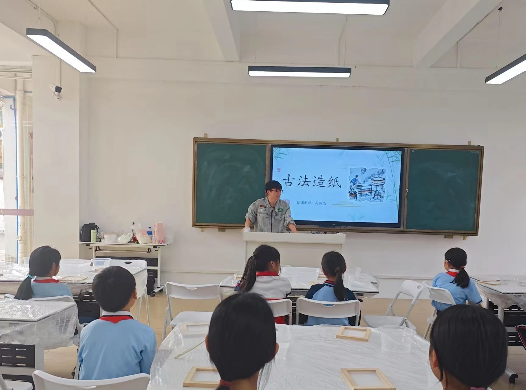 课程伊始,小高老师通过一则小谜语为同学们揭开了古法造纸的神秘面纱。随后,小高老师播放了一个生动有趣的视频,并配合着深入浅出的讲解,为同学们厘清了古法造纸的起源与发展,展示了完整的古法造纸流程,包括浸泡、蒸煮、舂捣、抄纸、晾晒等步骤。同学们听得津津有味,对古人的智慧和创造力钦佩不已。