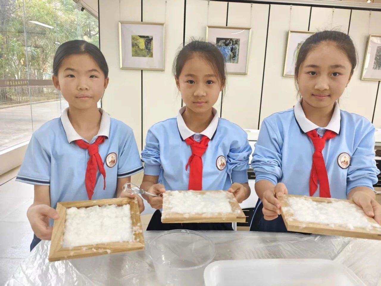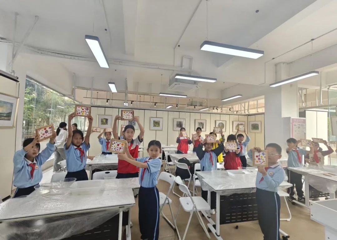 临近下课,小高老师展示了每位同学的作品,并选出了最受同学们欢迎的几幅作品。最后,本次的非遗课程在欢乐的笑声和明媚的笑脸中圆满结束。此次活动,不仅让同学们体验到了手工造纸的乐趣,更在他们心中种下了传承和弘扬中华优秀传统文化的种子。通过亲身体验和实践操作,同学们对非遗文化有了更直观、更深刻的认识,增强了文化自信和民族自豪感。