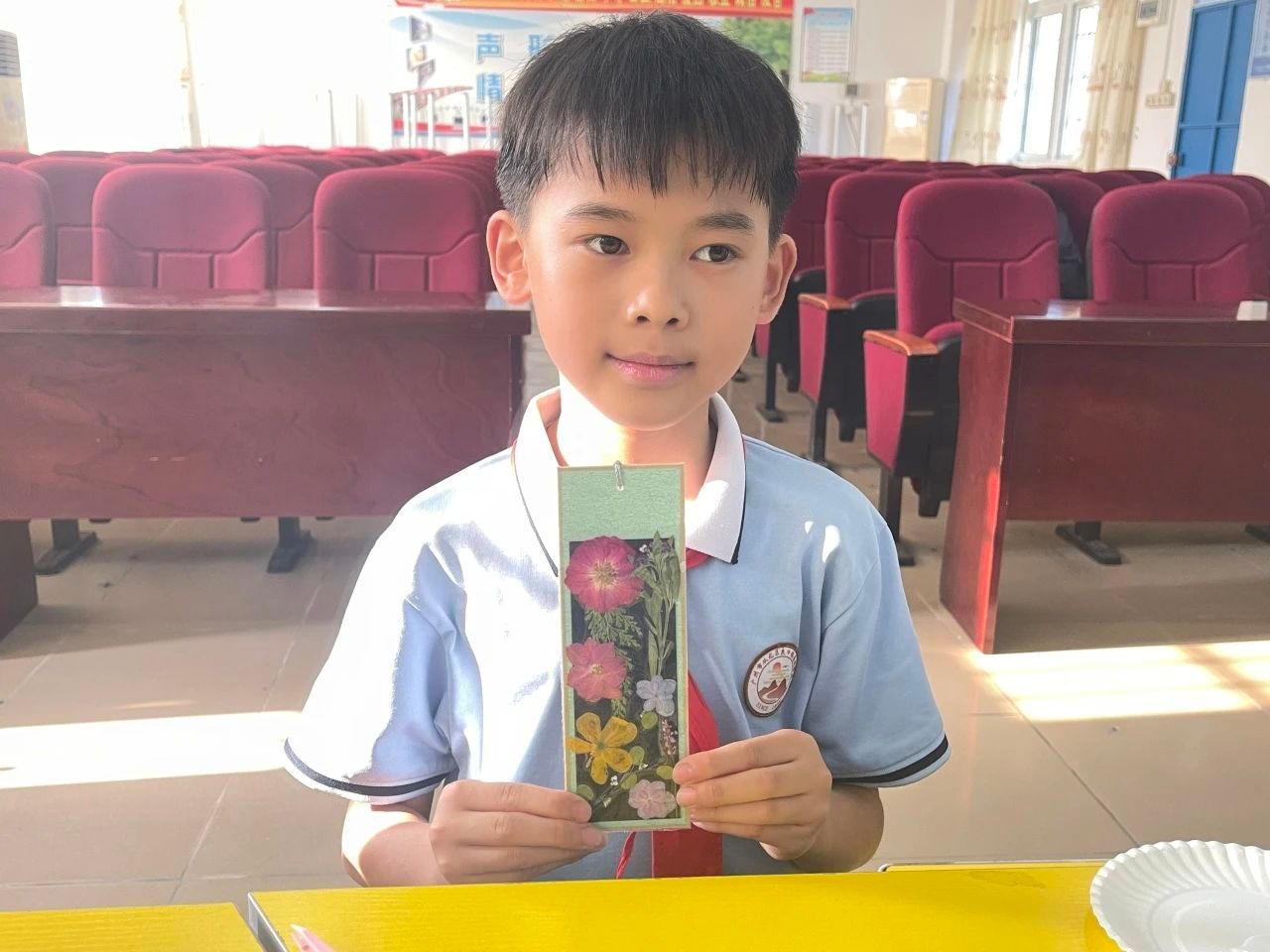 押花艺术的精髓在于对原材料的尊重与创意的无限发挥。在实践课上,小廖老师秉承这一理念,鼓励同学们充分发挥想象力与创造力。同学们兴致勃勃地行动起来,有的将花瓣拼成可爱的小动物形状,有的组合成美丽的风景。大家小心翼翼地将牙签沾上白胶,涂在花蒂处,拿起镊子将花瓣和叶子精心排列在书签纸上;接着撕开冷裱膜,对折后正面朝下轻轻按压,再用剪刀剪去多余部分。不一会儿,一幅幅精美独特的押花书签便诞生了。
