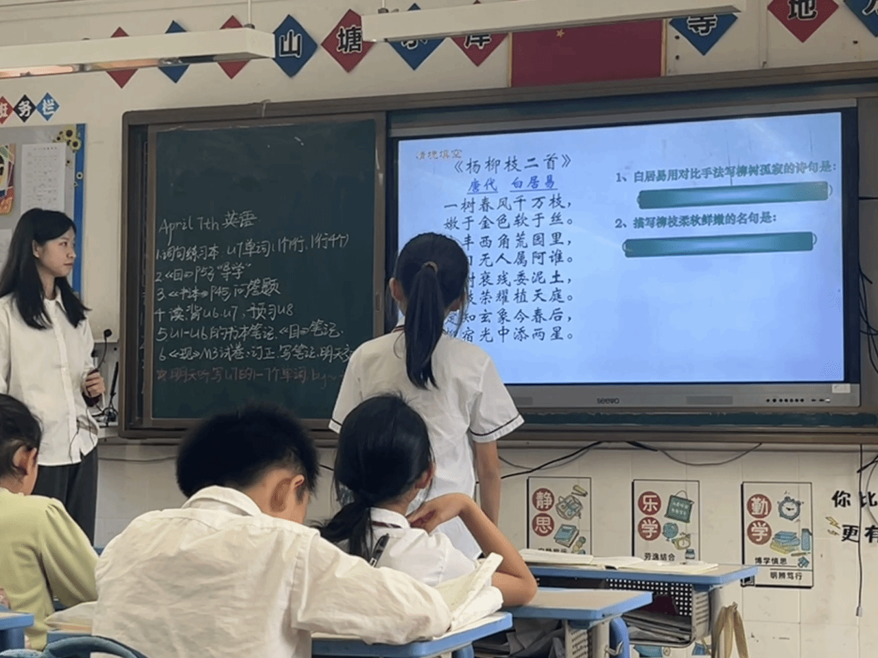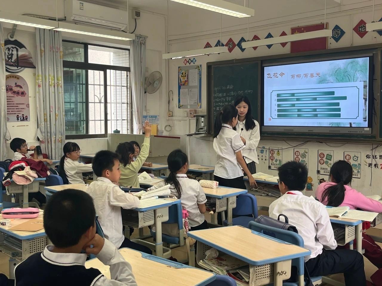 在课程的最后阶段,龙老师引导同学们通过飞花令回忆曾经学过的写杨柳与写春的诗词,同学们积极参与,在下课铃声响起时,愉快地结束了这一堂课。