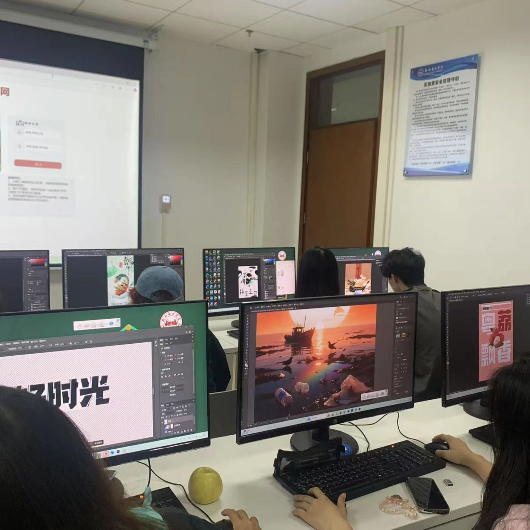 在经过小老师们的授课以及头脑风暴环节后。同学们着手对自己海报风格设计,同学们运用课上“水果海报”“风格化设计”进行绘制作品。
