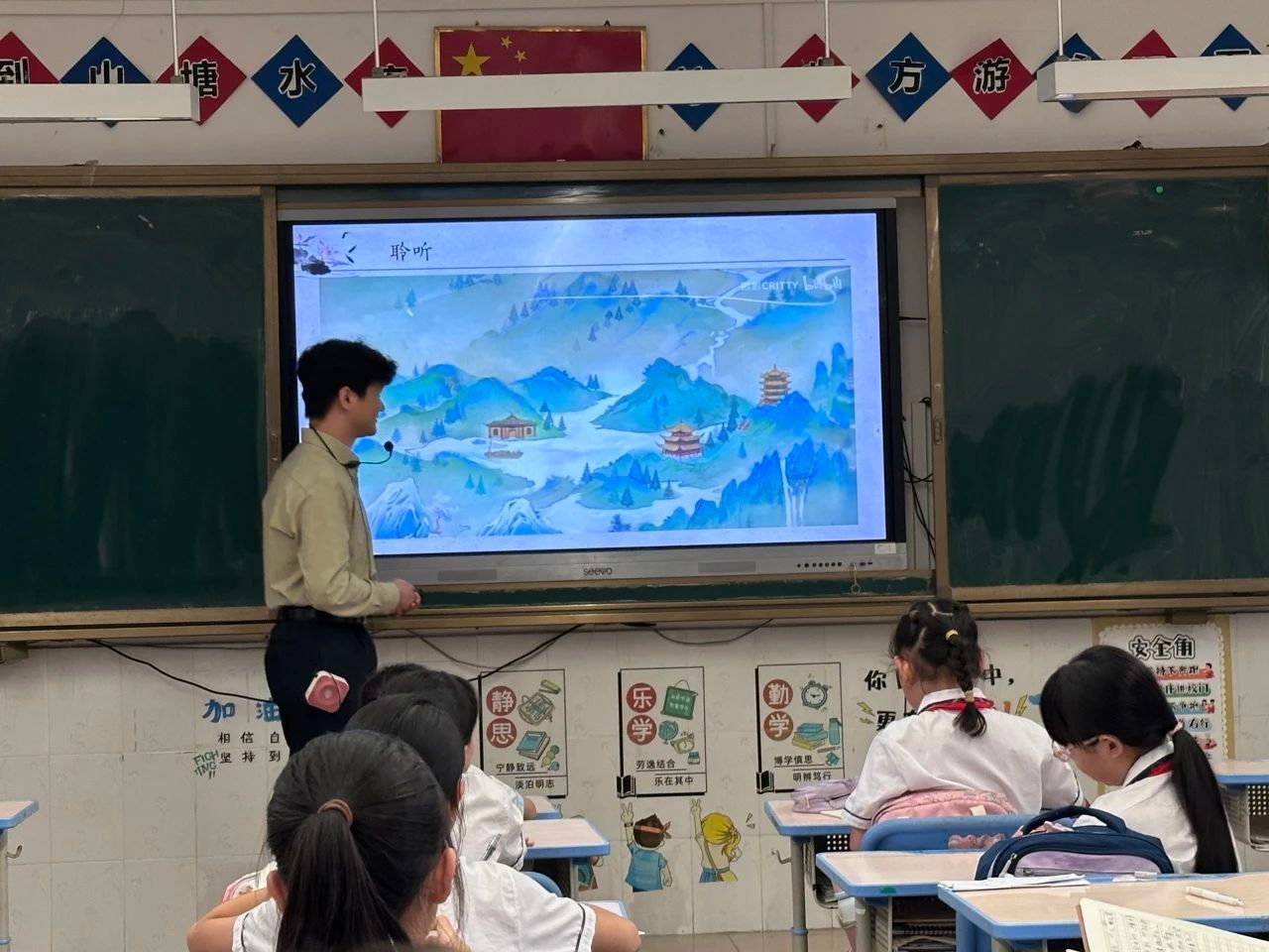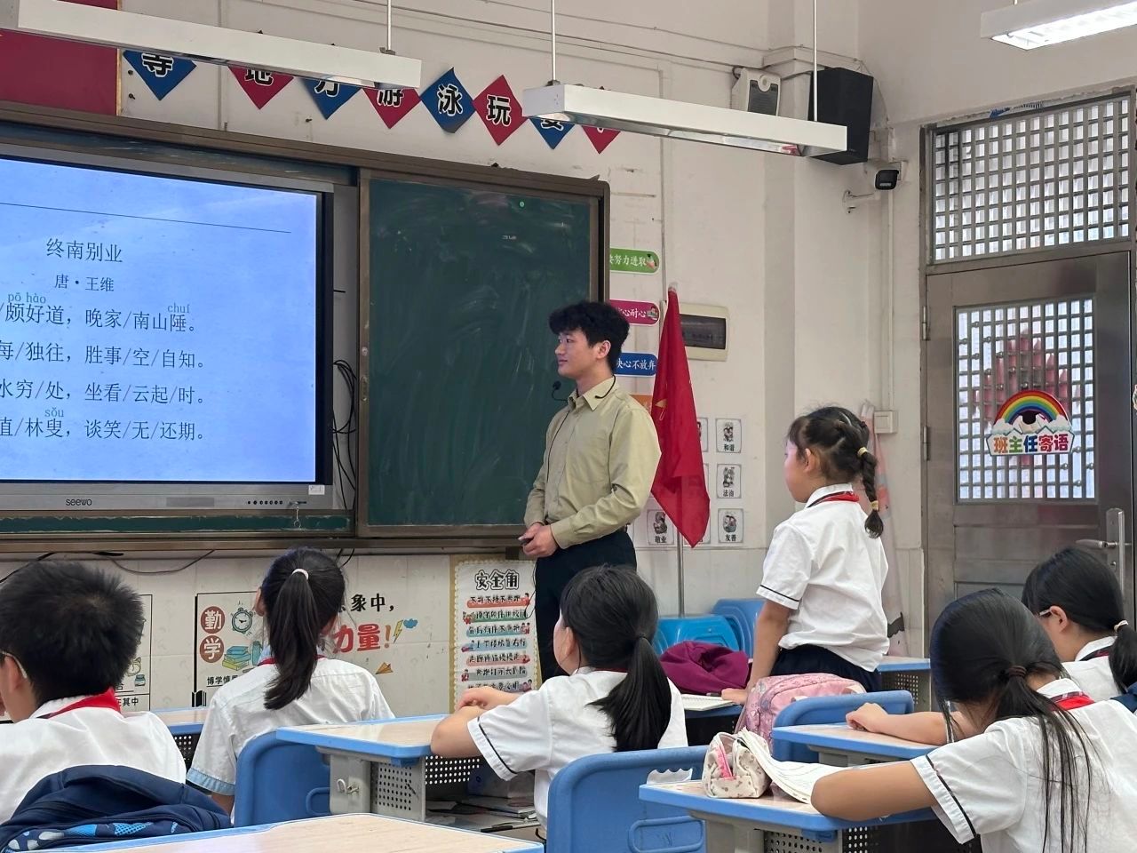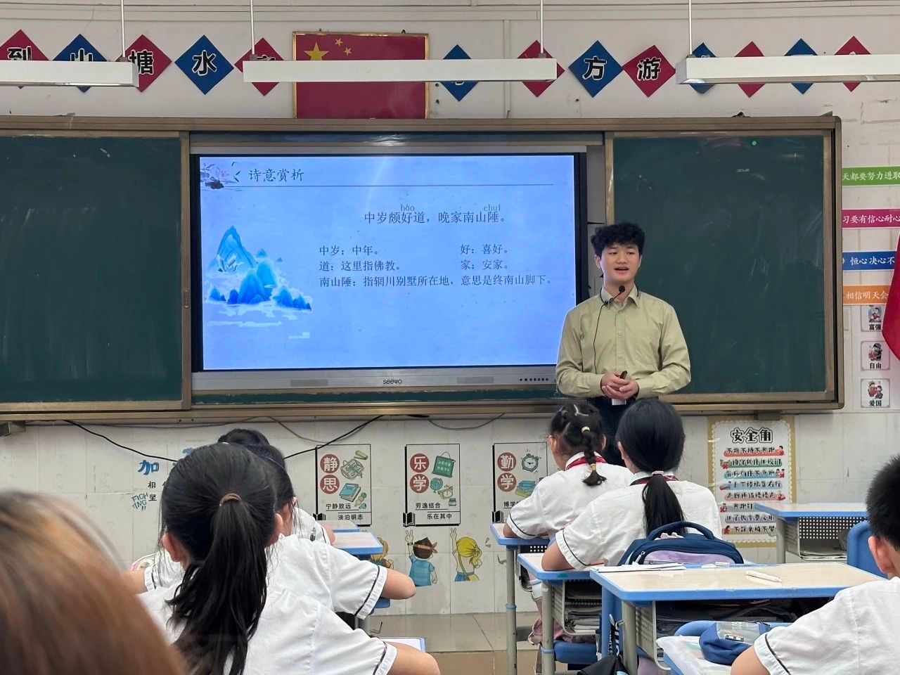 在朗诵诗歌之前,小莫老师为同学们讲解了本首诗的生僻字“陲”和“叟”,以及多音字“好”“兴”。随后,同学们在老师的带领下齐读诗词,读书的声音整齐洪亮。在诗歌讲解环节中,小莫老师首先向同学们提问每个字的意思,再将每个字连成句得出诗歌大意,引导同学们学会自己翻译诗歌,最后对照译文加深理解。