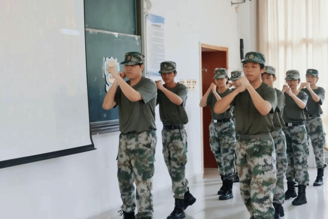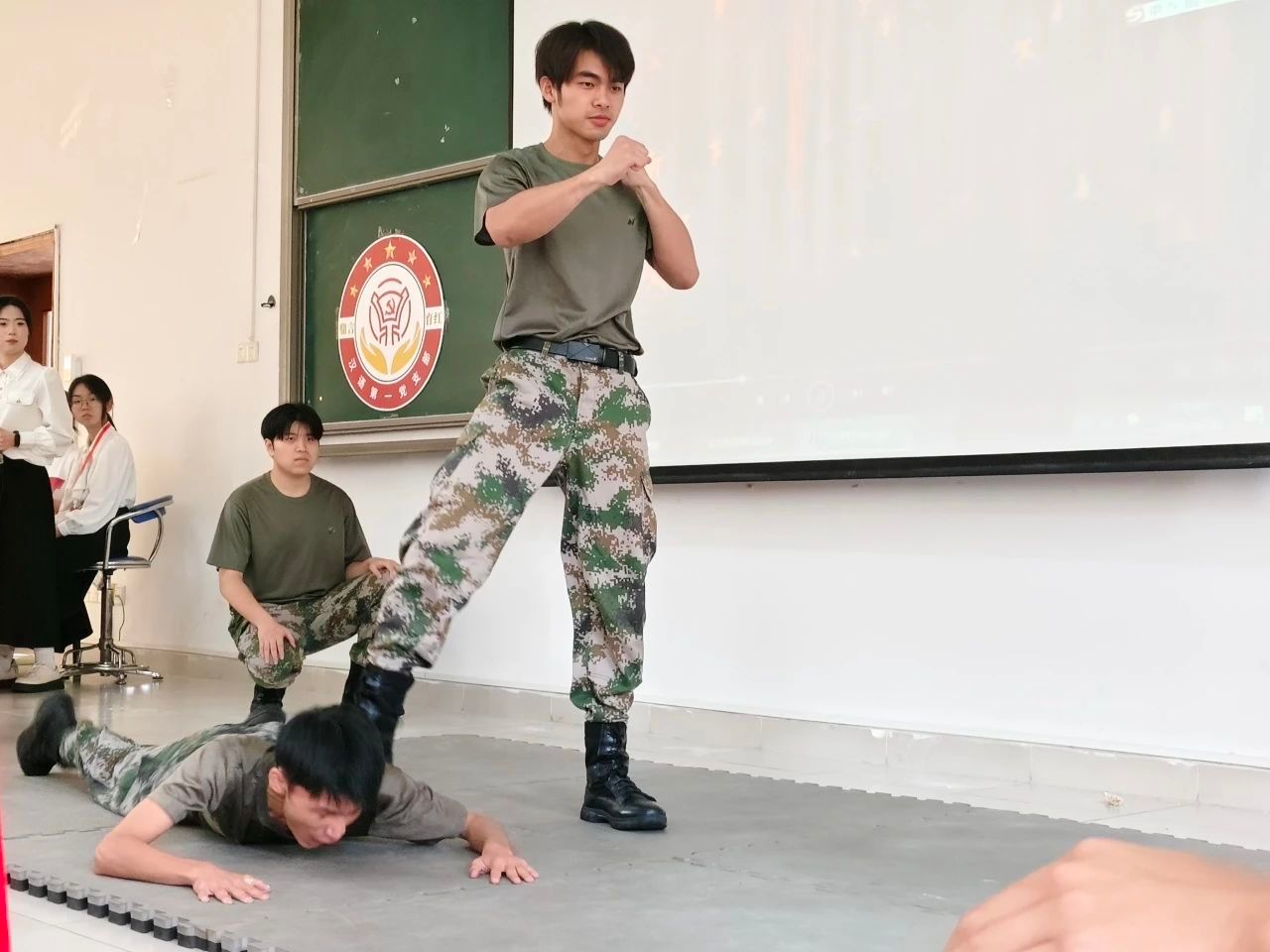 拳术表演,队员们身姿挺拔,眼神坚毅。他们身姿矫健,拳脚如风,每一次出拳都刚劲有力,似能劈开云雾;每一次踢腿都虎虎生威,如能撼动山河。他们的动作整齐划一,配合默契,尽显军人的飒爽英姿。整齐划一的动作搭配铿锵有力的口号,如同奏响激昂的军魂战歌,引得同学们掌声如潮。