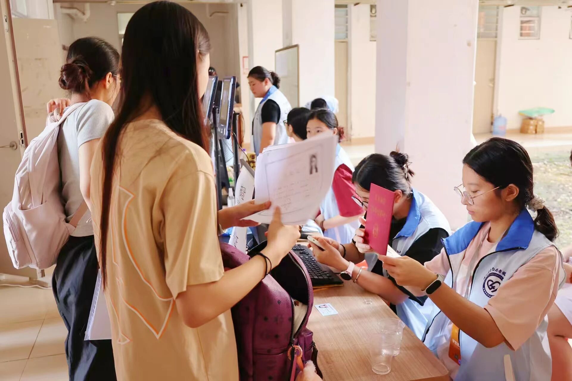 朋辈辅导员耐心指导新生并发放体检表