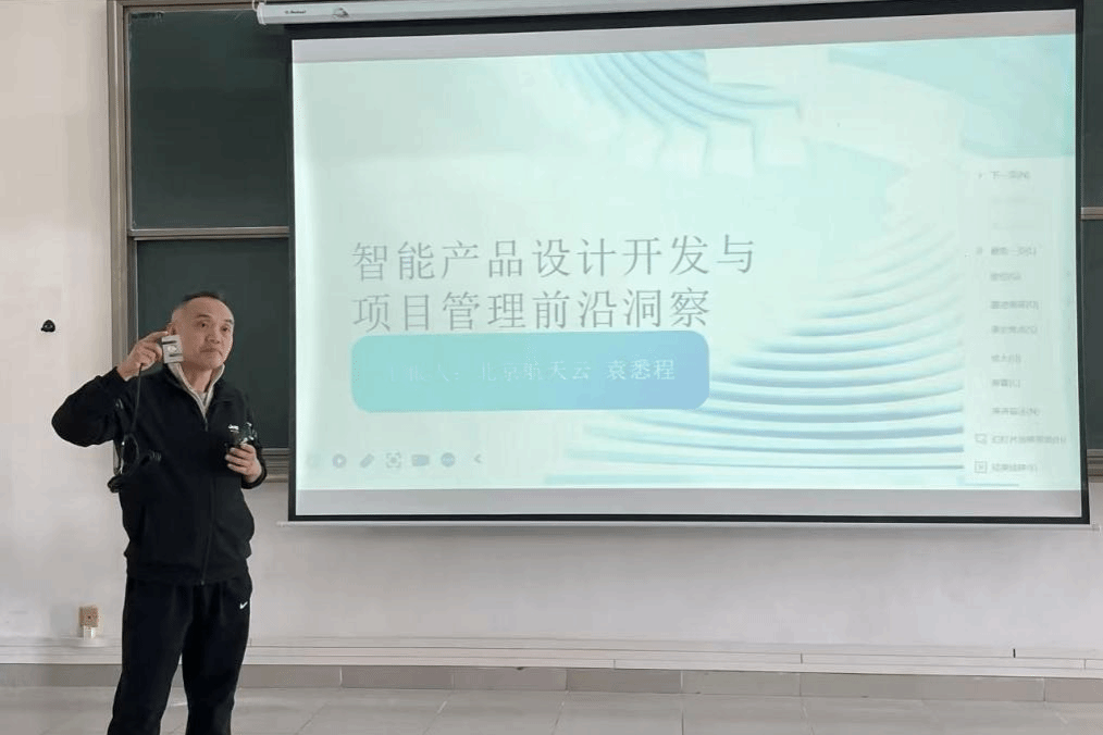 为使同学们紧跟科技发展前沿,深入了解智能产品从概念到落地的全过程,2025年11月19日下午,一场以“智启未来——智能产品设计开发与项目管理前沿洞察”为主题的专题讲座成功举办。本次讲座特邀北京航天云教育公司总经理、前中国航天系统工程师袁悉程先生担任主讲,为同学们带来了一场融合顶尖行业视角与实战方法论的知识盛宴。