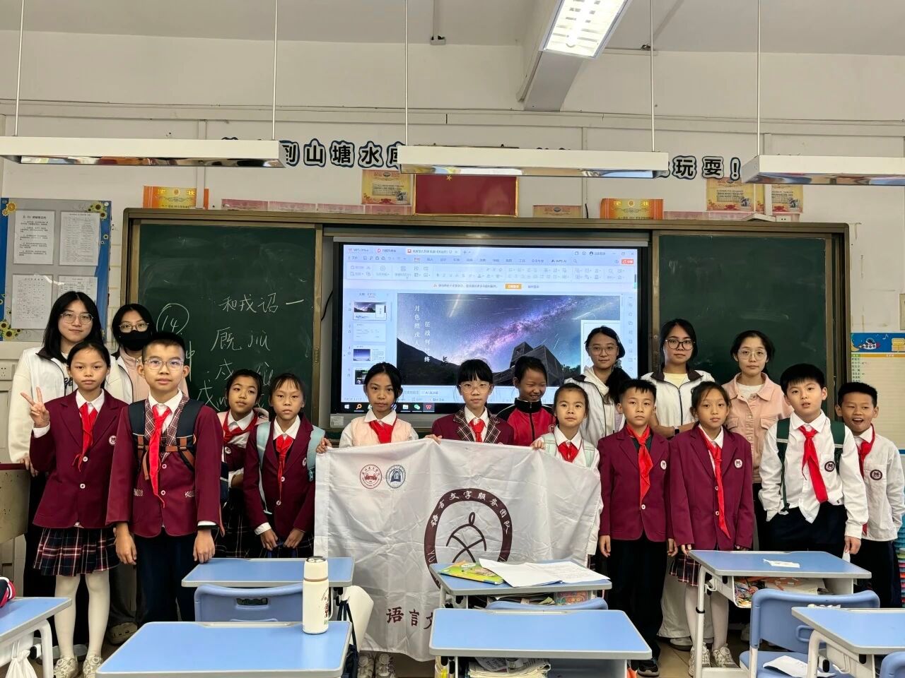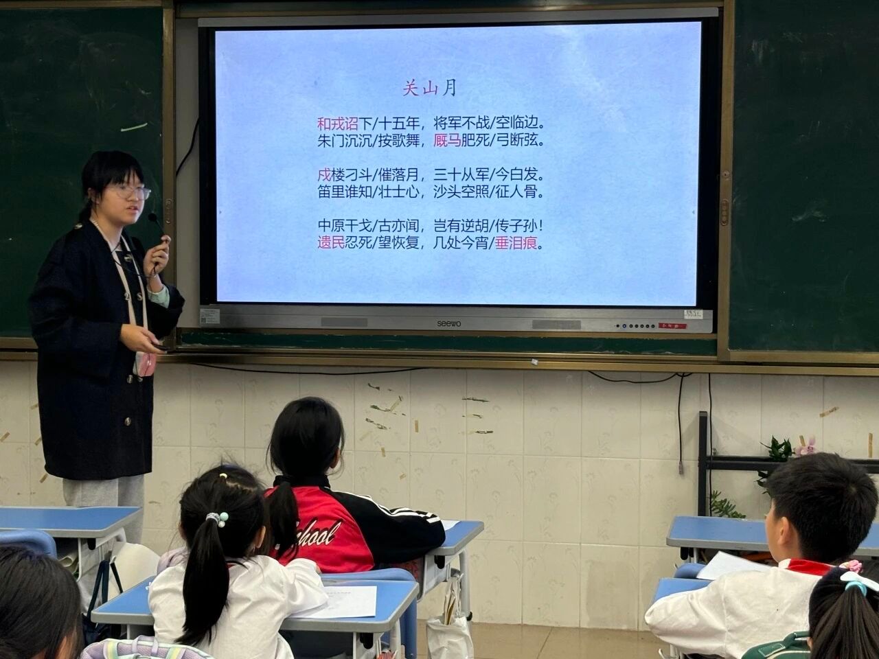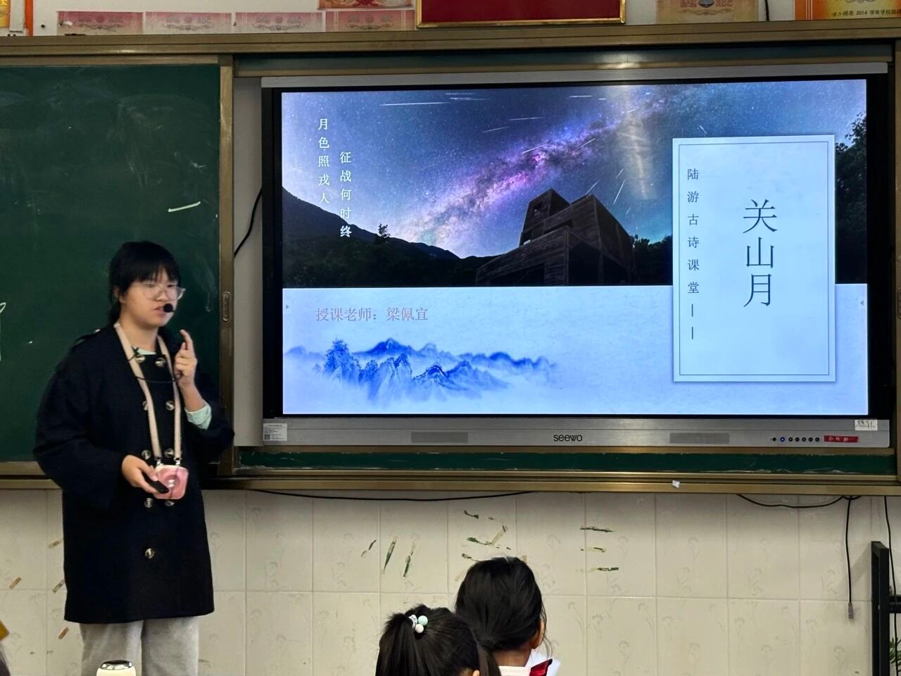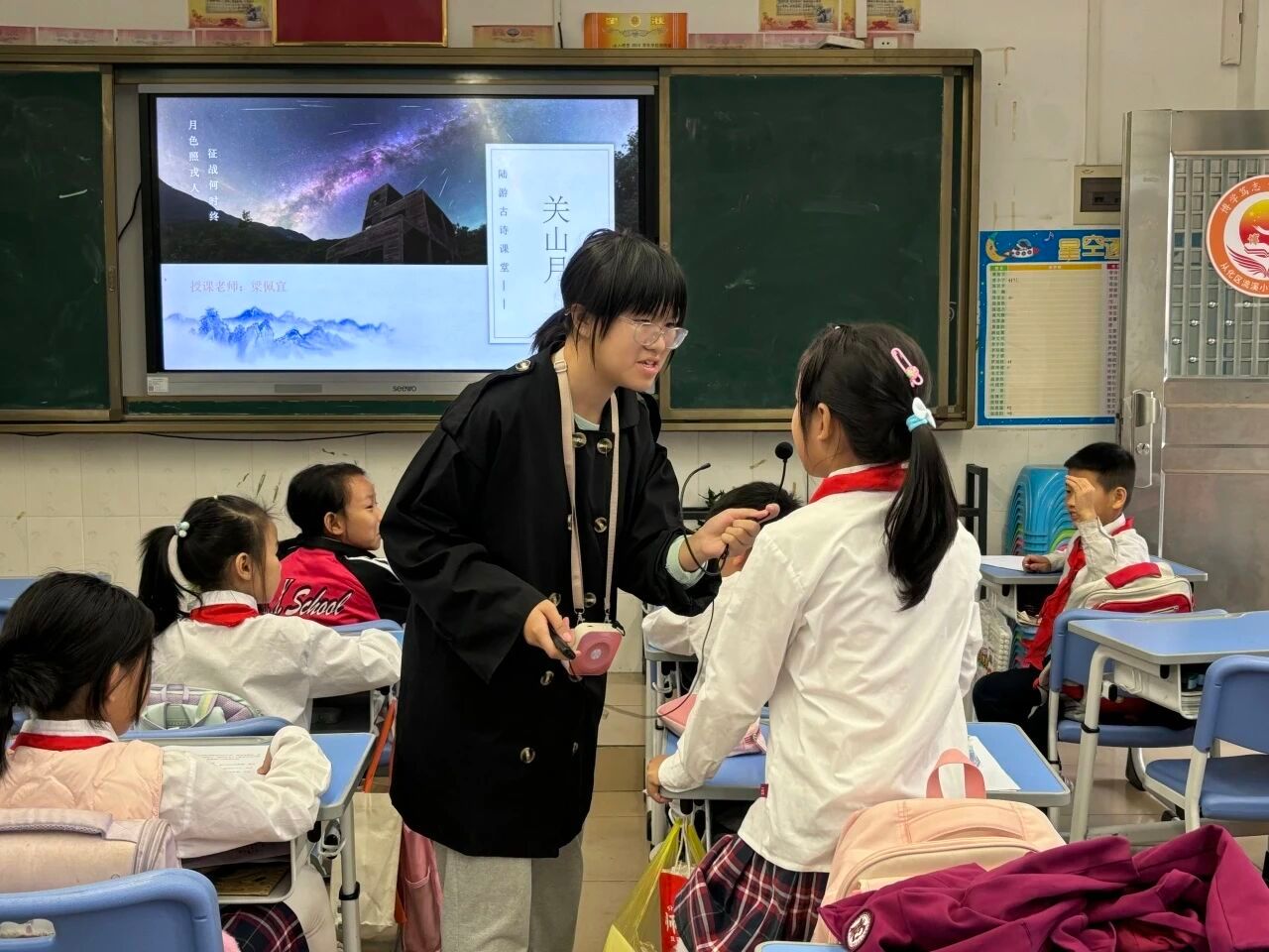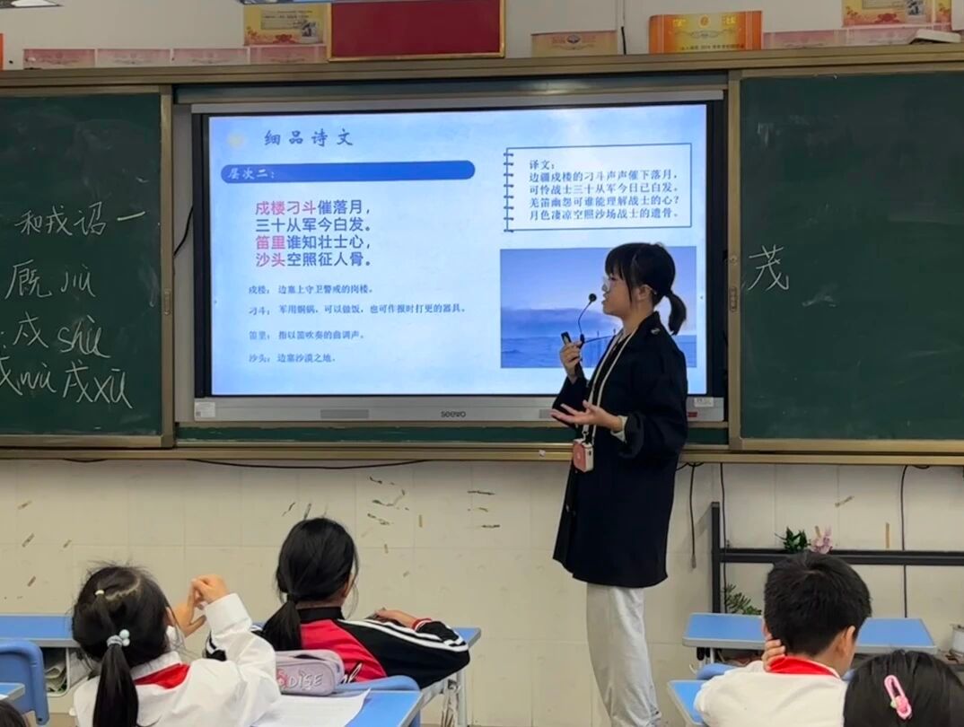 2025年11月3日,语言文字服务团队在石巧如老师的带领下走进流溪小学,本次担任古诗词课堂小老师的是梁佩宜。本堂课,梁老师以陆游的《关山月》为核心,带领同学们走进南宋戍边场景,解锁诗人藏在诗句里的“忧国丹心”。