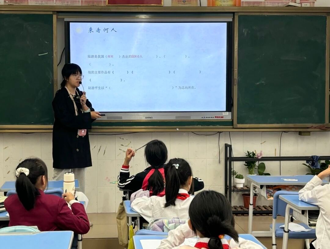 课堂伊始,梁老师没有直接切入诗句,而是先以“来者何人”的互动提问引出陆游——她在屏幕上展示填空:“陆游是我国( )杰出的( )、( )、( )”,引导同学们主动回答“南宋”“爱国诗人”“史学家”,再补充他的《示儿》《卜算子·咏梅》等代表作,点明其“抗金复国,收复失地”的毕生志向。紧接着,她播放了一段介绍南宋“符离大败后议和”的历史短片,让同学们直观感受《关山月》的创作背景,瞬间拉近了与千年古诗的距离。