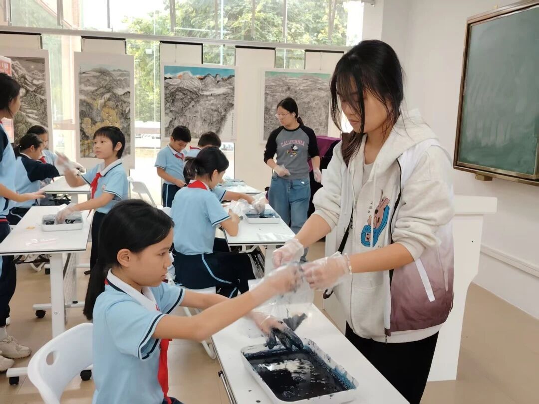 2025年11月11日,威廉希尔williamhill中文语言文字服务团队在游婉雯老师的带领下,走进善施学校,开展了一场别开生面的抽绳袋扎染体验课程。