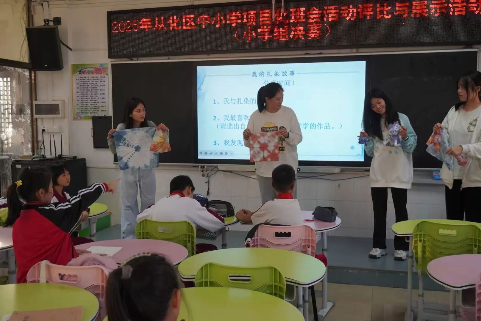 临近尾声,小田老师向同学们抛出一个富有挑战性的问题:“如果我们为从化设计一款扎染旅游纪念品,你会怎么设计?”问题一出,孩子们的想象力如泉水般涌出——“一个印有荔枝图案的书包!”“扎染发圈,每天都可以戴!”“一条有流溪河颜色的扇子!”……他们争先恐后地表达自己的想法,每一个回答都是对非遗扎染真挚喜爱的印证。
