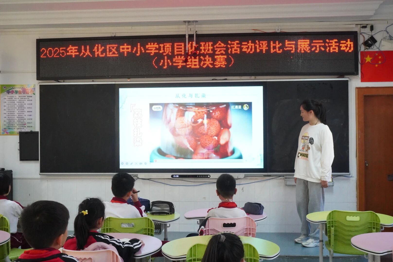 随后,课堂进入“我的扎染故事”分享环节。孩子们脸上洋溢着灿烂的笑容,小手齐刷刷地举起,迫不及待地想讲述自己与扎染之间的点滴回忆,也渴望聆听他人的创作趣事。在一片热情洋溢的氛围中,小田老师顺势将话题引向“从化与扎染的故事”。她先播放了一段精心准备的视频,带领同学们初步认识扎根于本土的“从化扎染”。视频之后,小田老师借助PPT进一步讲解了从化扎染的独特之处。她告诉大家,从化的荔枝壳、黄皮叶等自然材料,都可以作为染色的原料;而荔枝、流溪山水、温泉等地方元素,也可以融入扎染的图案设计中。这不仅让扎染艺术更加贴近生活,也让孩子们对家乡的文化资源有了全新的认识。课堂中不时发出阵阵笑声与讨论声,扎染的魅力在轻松愉快的氛围中悄然传递。