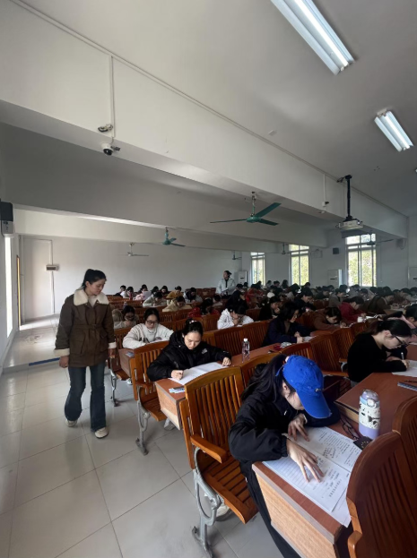 考试期间,学院创新构建“学院领导+两办老师+任课教师”的三级联动巡考机制,由学院领导带队,教务办公室与学生工作办公室相关人员随同组成的巡考组深入各考场,开展全方位、全覆盖的巡考检查。 巡考人员重点巡查考场秩序、监考教师履职情况及学生考试状态,仔细核查考生双证(学生证、身份证)是否齐全、试卷管理是否严格、考场布置是否规范。从巡考情况看,各考场秩序井然,监考教师认真负责,严格执行“签到表发放”“诚信承诺书填写”“答题纸信息核查”等监考流程;学生自觉遵守考试纪律,沉着应考,展现出良好的学风与考风。对巡考中发现的细节问题,巡考组现场提出整改意见,并督促立即落实,确保考试工作顺利进行。