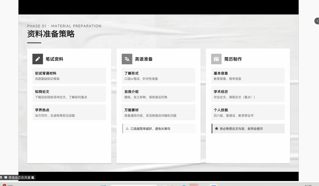 李浩业同学从专业课、英语口语、简历材料、面试现场及长远规划五个维度进行了系统性讲解。他强调,专业课复习需回归初试基础,同时深挖目标导师近期论文与学界热点;面试环节需展现自信与礼貌,答辩内容需紧扣简历。