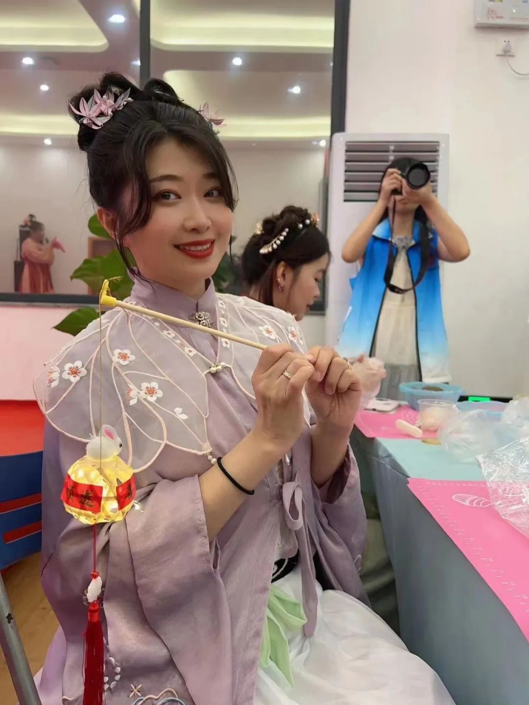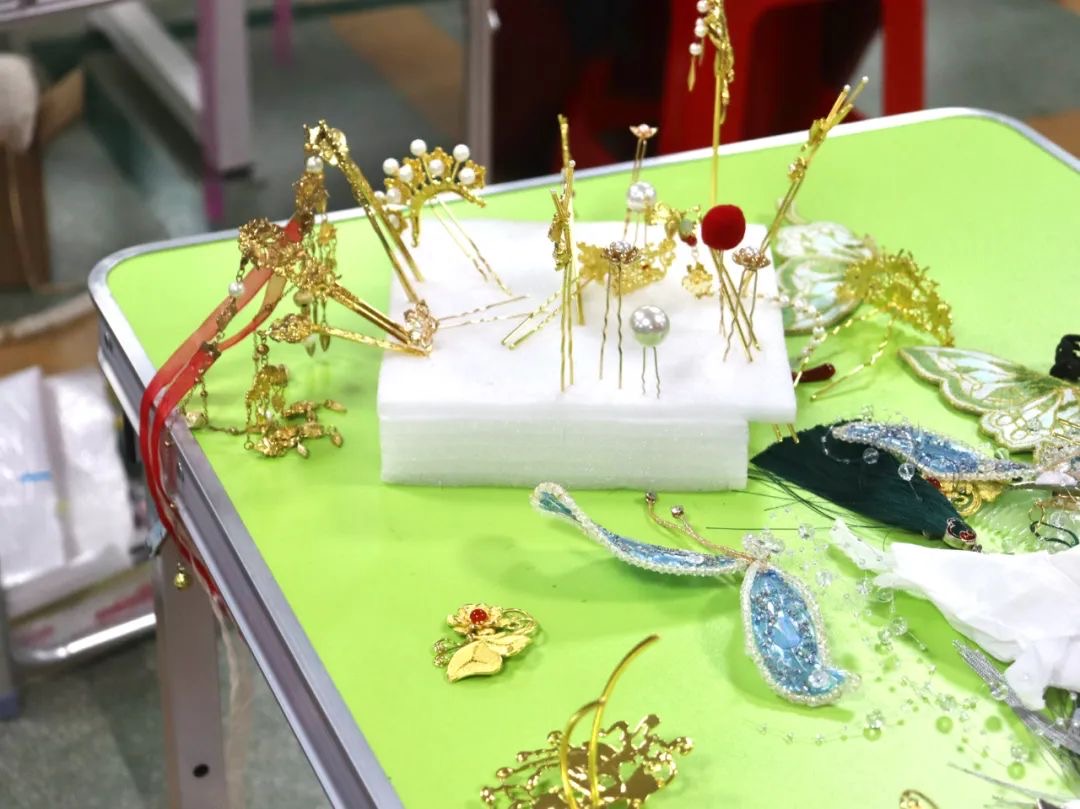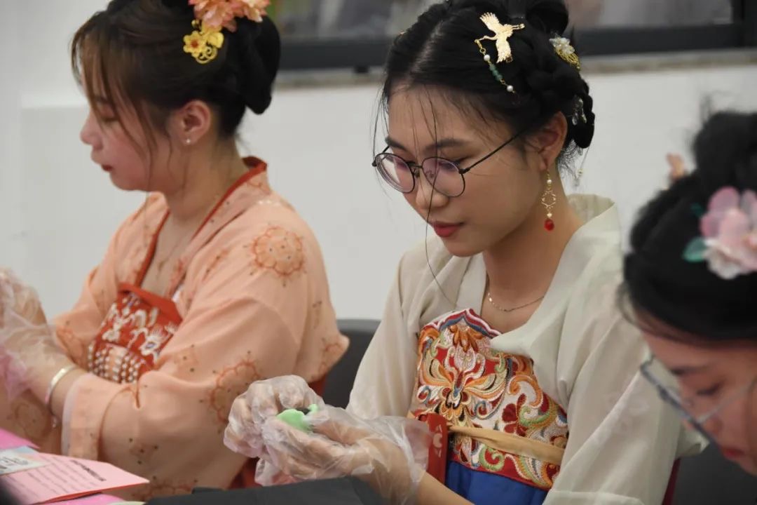 活动会场正在有序准备的同时,老师和同学们在文化馆的化妆室内精心打造自己的国风造型,身着精致得体的汉服,佩戴承载国风雅韵的配饰,师生之间亦师亦友,互相为对方的造型“点赞”。