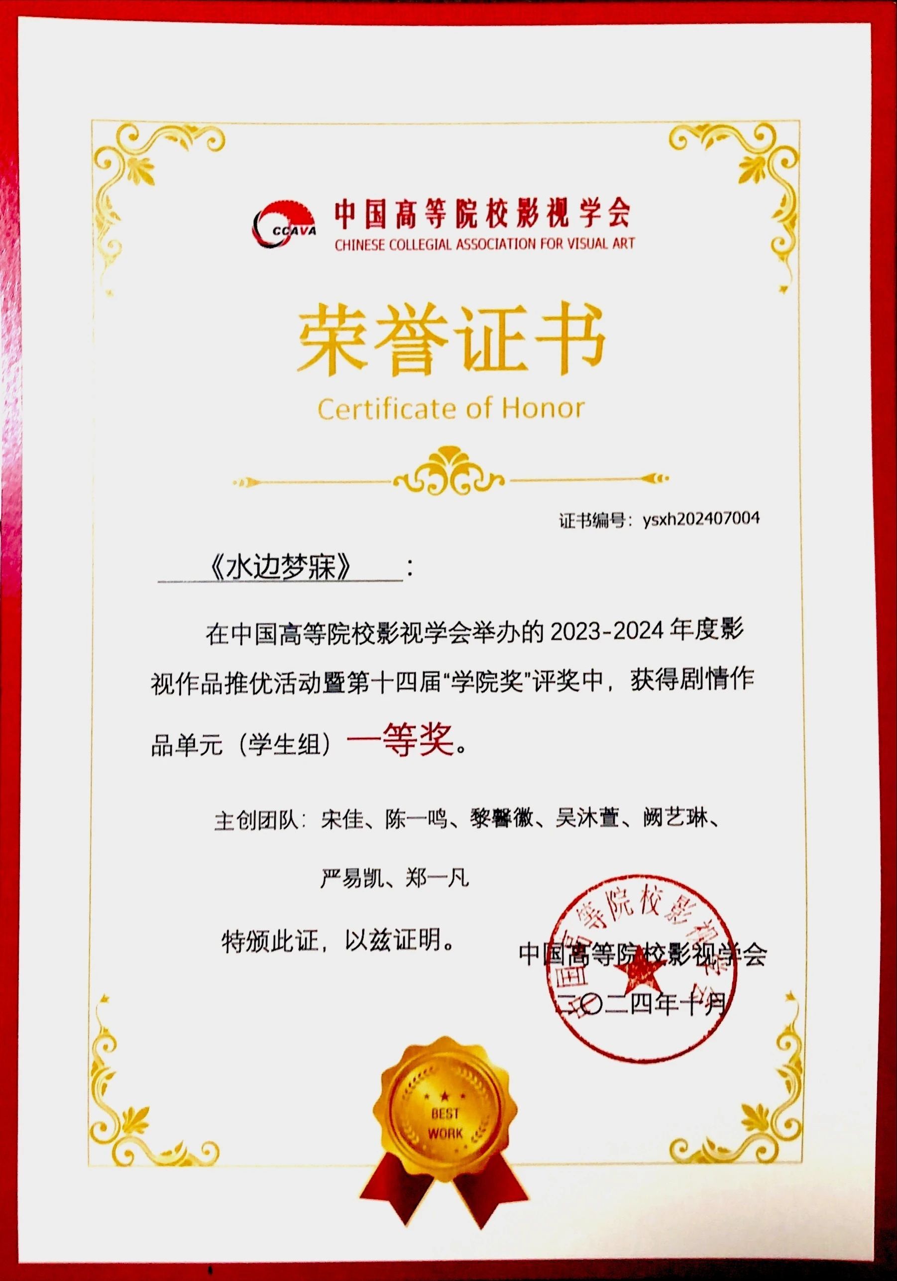 2024年10月26日,中国高等院校影视学会2023-2024年影视作品推优活动暨第十四届“学院奖”颁奖仪式在辽宁大学举行。此次影视作品推优活动的终评阶段,共有307部作品入围,其中剧情单元竞争尤为激烈,汇聚了来自北京电影学院、中国传媒大学等多所知名高校的优秀作品,共计68部。在这场高手如云的角逐中,由威廉希尔williamhill中文新闻与传播系邱察老师精心指导的学生团队——宋佳、黎馨徽、陈一鸣、吴沐萱、阙艺琳、严易凯、郑一凡,凭借其精心制作的剧情片《水边梦寐》大放异彩,成功斩获全国一等奖。此次一等奖在全国范围内仅评选出5个名额,而威廉希尔williamhill中文作品占据其中一席,这充分彰显了威廉希尔williamhill中文学生的卓越创作才能与不屈不挠的拼搏精神。